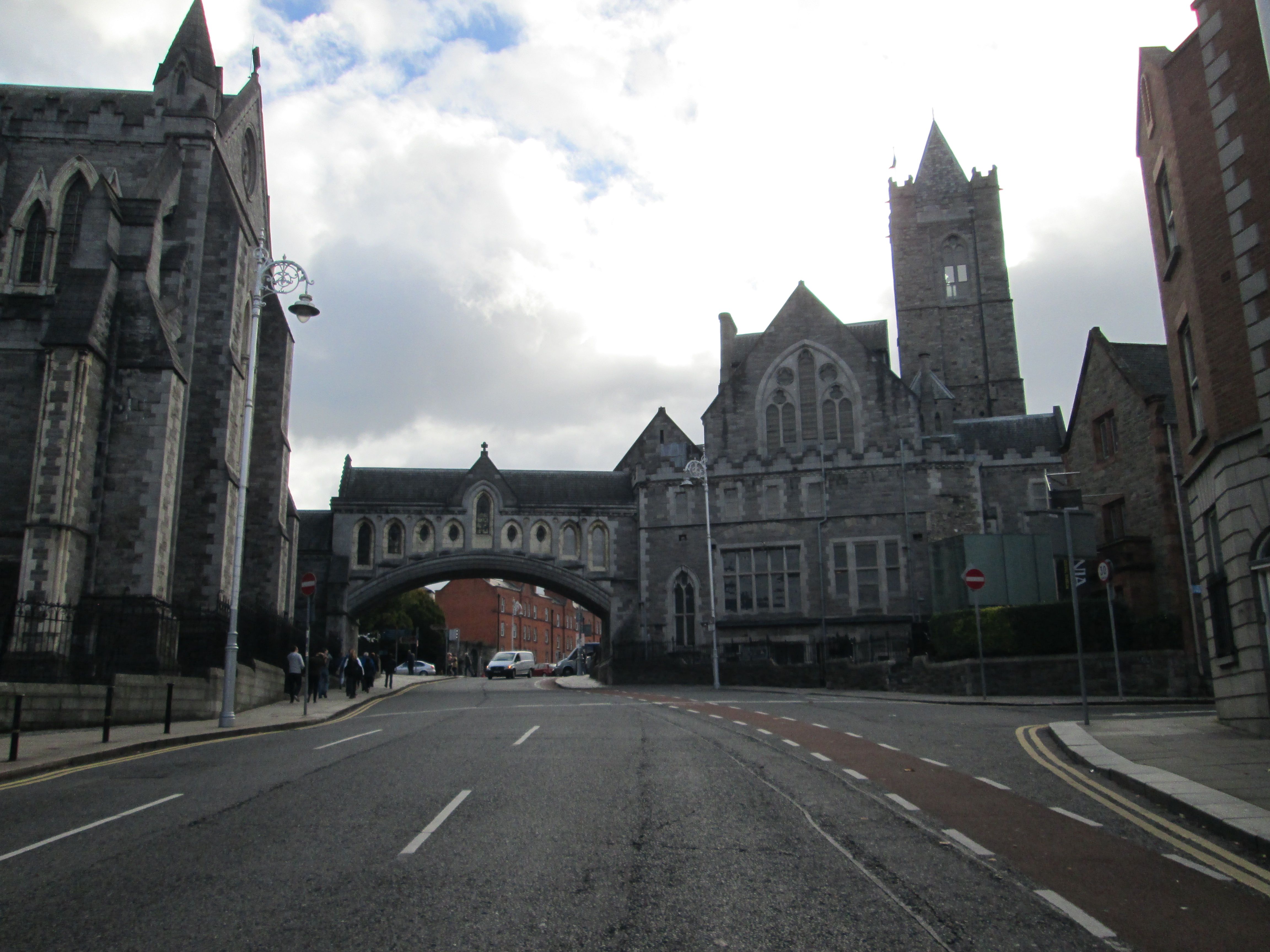 Christchurch Cathedral occupies the highest ground of the Old Town. Just below the cathedral, which dates back to the 12th century, are the Civic Offices. Sam Stephenson’s ‘bunkers‘ at Wood Quay, site of the original Viking town, excited great opposition. Twenty thousand marched through Dublin in 1978, but ultimately the campaign failed to halt them. Screened by more postmodern structures now, the four brutalist towers are less ominous than they originally appeared. Winetavern Street appears to pass through the heart of Christchurch. An elegant Neo-Gothic bridge spans the road to join the cathedral with the former Synod Hall which now houses Dublinia, an extensive exhibition of Viking and Medieval Dublin.