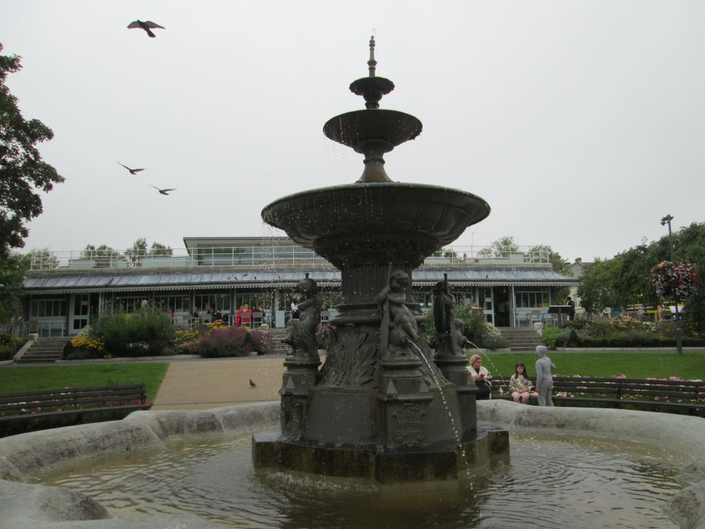 The modern rail connection passes through the cutting below, that will travel the full length of Modern Dun Laoghaire’s seafront. For us, the Metals ends nearby, for now. The People’s Park stretches between the seafront and George’s Street, Dun Laoghaire’s main thoroughfare. On the site of a disused quarry, it was opened in 1890 along a formal design by J.L. Robinson. There’s a gate lodge, an ornate bandstand and an impressive central fountain. Along the western flank, near George’s street, the lovely restored pavilion houses an elegant cafe; Fallon and Byrne’s. At the end of our walk, it is time for, another, reward. Really, at any time, one must seize the pleasure of a leisurely half hour or so, in sunshine on the veranda with an aromatic cup of coffee, and more besides, looking out over the park, as children play and people pass, as seabirds swirl and time stands still.