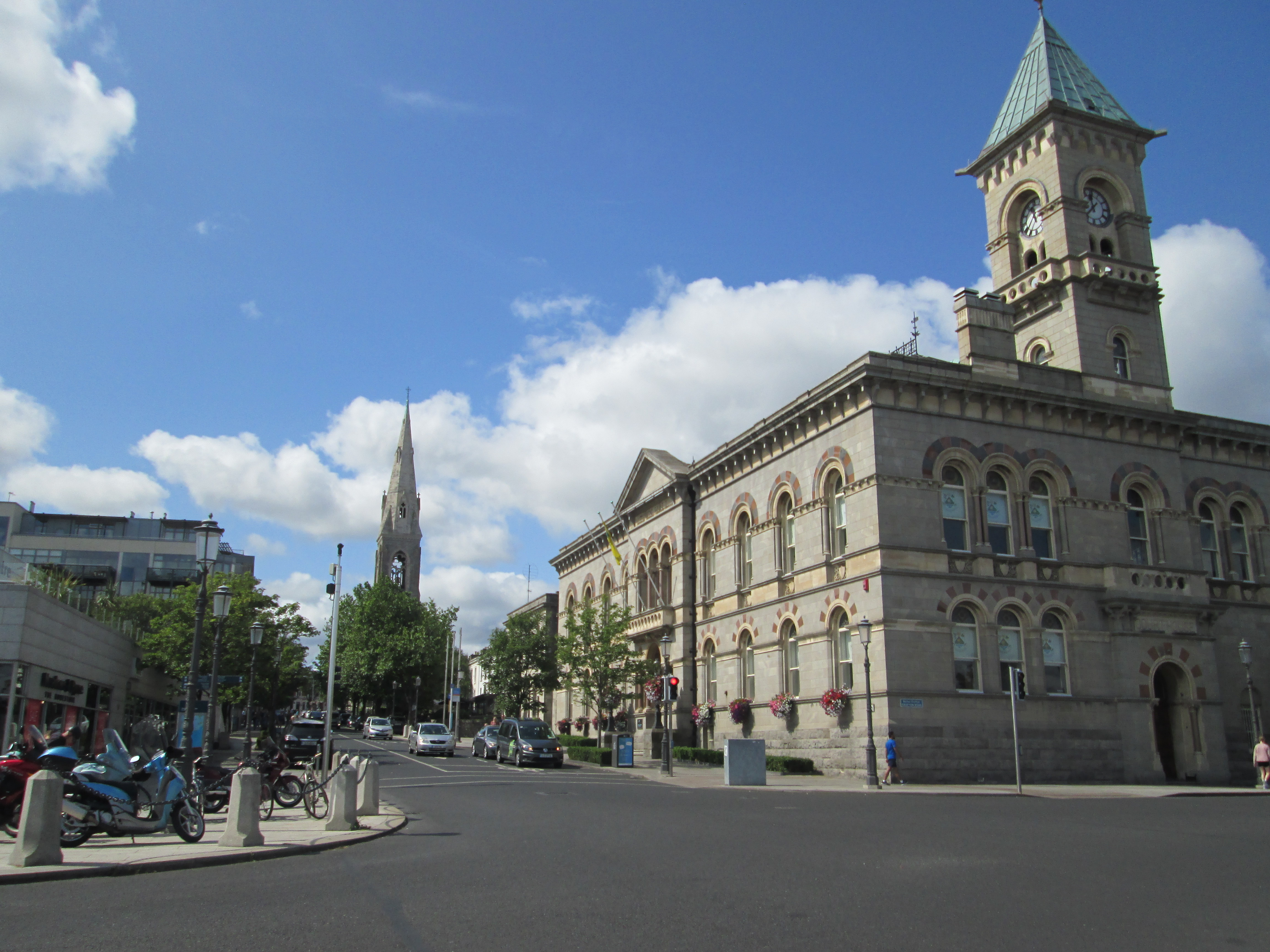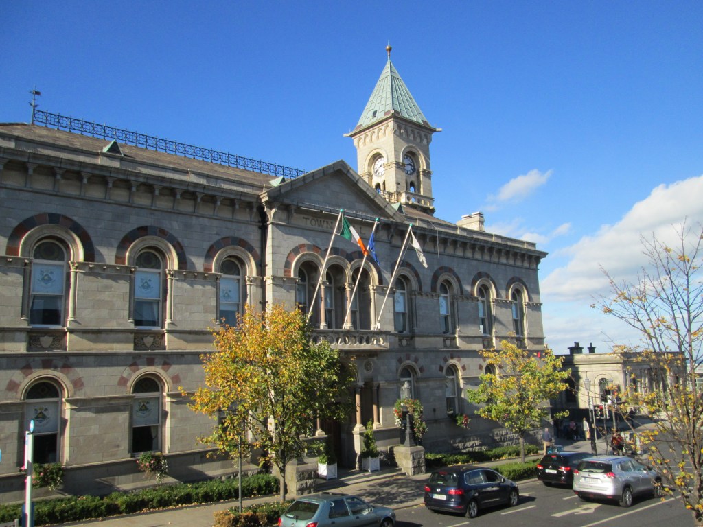 The Town Hall, across the road, is an attractive building in the style of an Italian palace with high slender clocktower and coloured brickwork. Designed by John Loftus Robinson in 1879, it incorporated the courthouse, municipal offices and a public hall. Perfectly preserved, it now forms part of the County Hall for Dun Laoghaire Rathdown.
