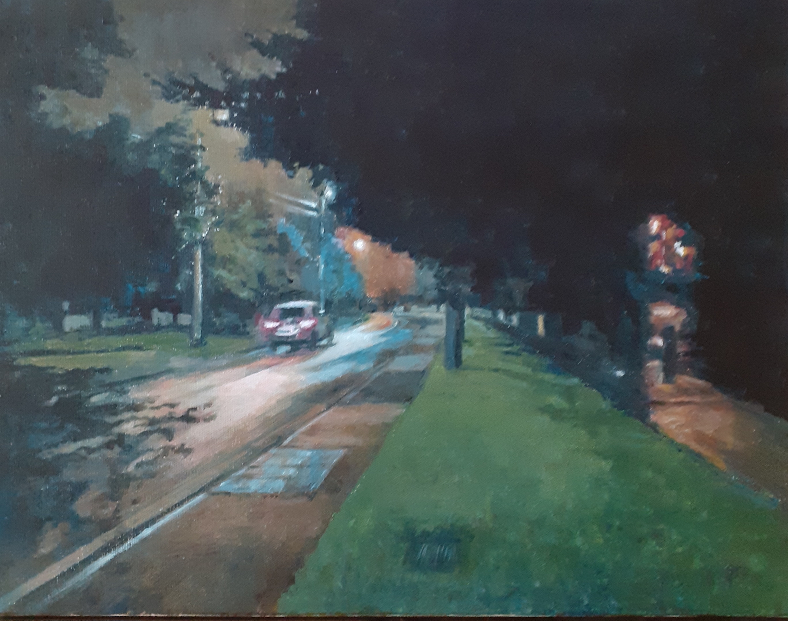 Climbing to the top of Fairyhill, the Killarney Road heads towards Ballywaltrim and the Southern Cross. Fairyhill has a commanding view of Bray and South Dublin. Little wonder that it would become a holy place, with Pagan and Christian resonances. St Saran’s Cross crowns the hill, an early marker of civilisation in Bray. In this painting, Fairyhill is to the right, its entrance through the keyhole like aperture in the dark triangle of shading trees. To the left the land falls away, discreet detached houses front the main road, my estate of Ripley Hills lies just a few steps farther on. The car, heading south, will pull its glow with it, to wherever it is it’s going. There will be a breath of silence as the spirits whisper to the sea and stars, before another traveller passes through.