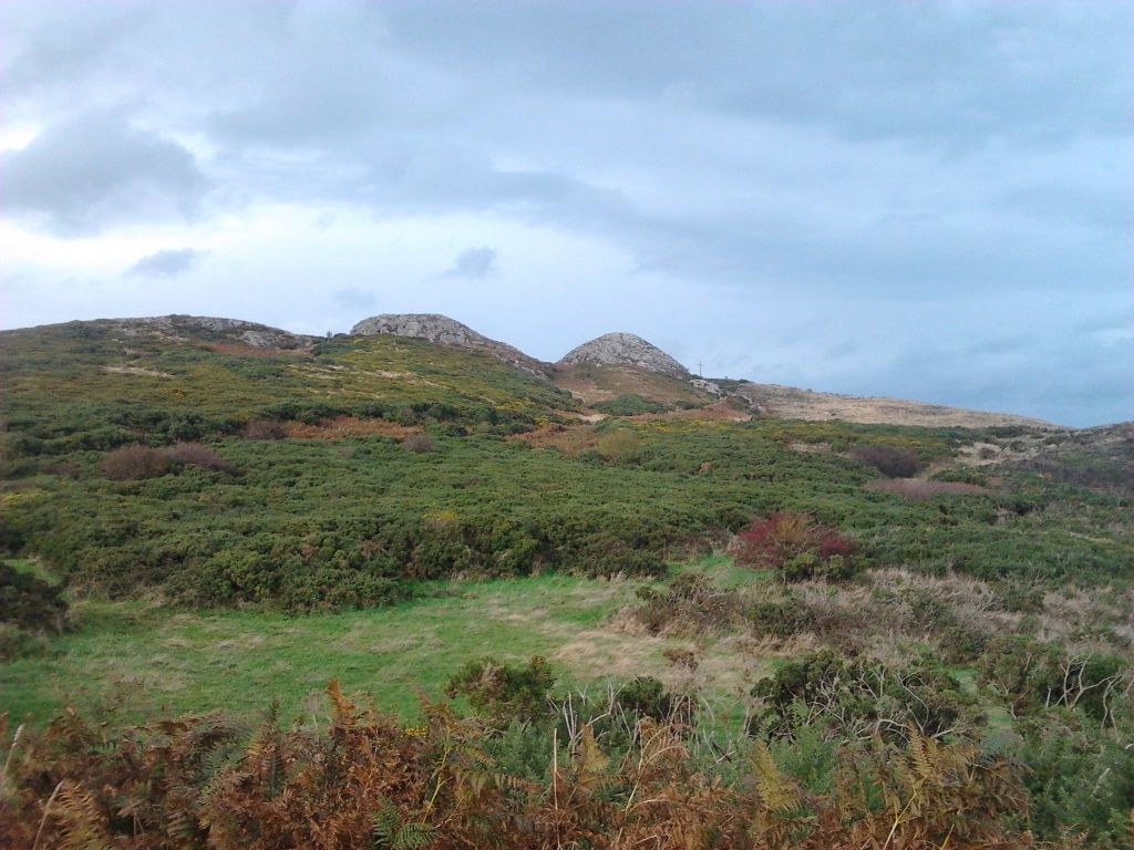 From the Cross, a path leads over a stile and you step into a wild uplands. Bray Head forms a surprisingly extensive upland area. You can be lost in a world of your own up there. Two distinct ridges become apparent, each defined by rows of rocky outcrops. The first falls behind us, marked by the cross on the easternmost dome. The other is before us, slightly higher and including the summit. A lazy hammock of furze and grass is swung between them, roamed by random groups of goats and ponies.