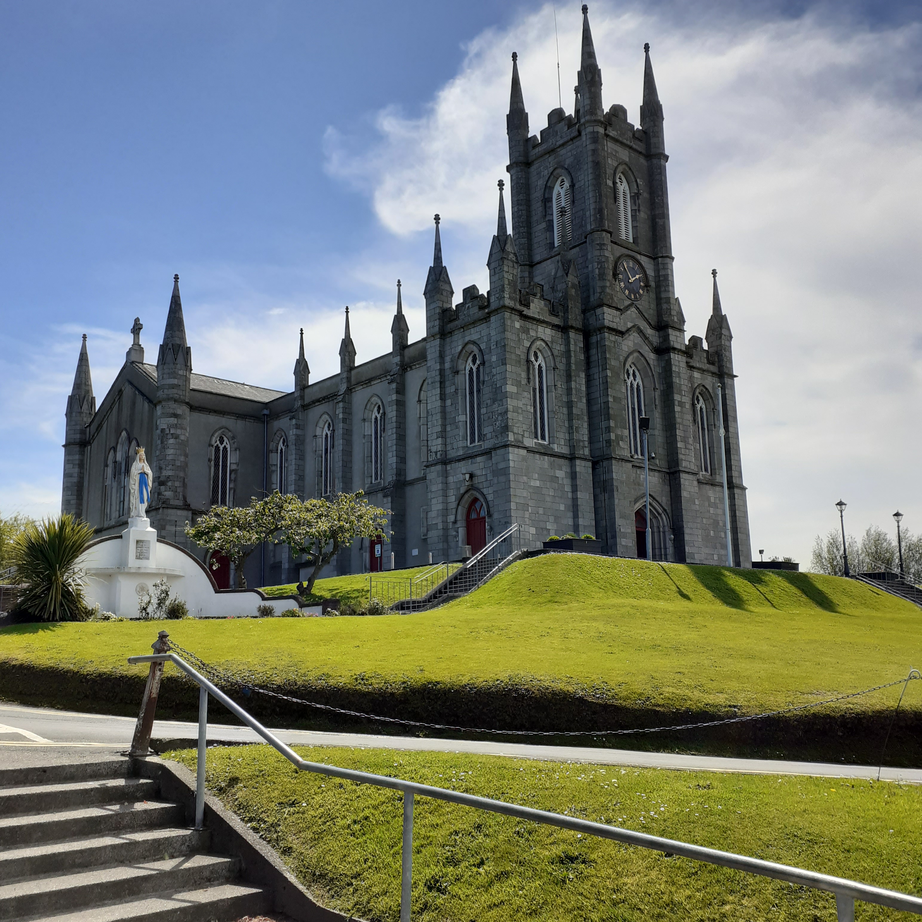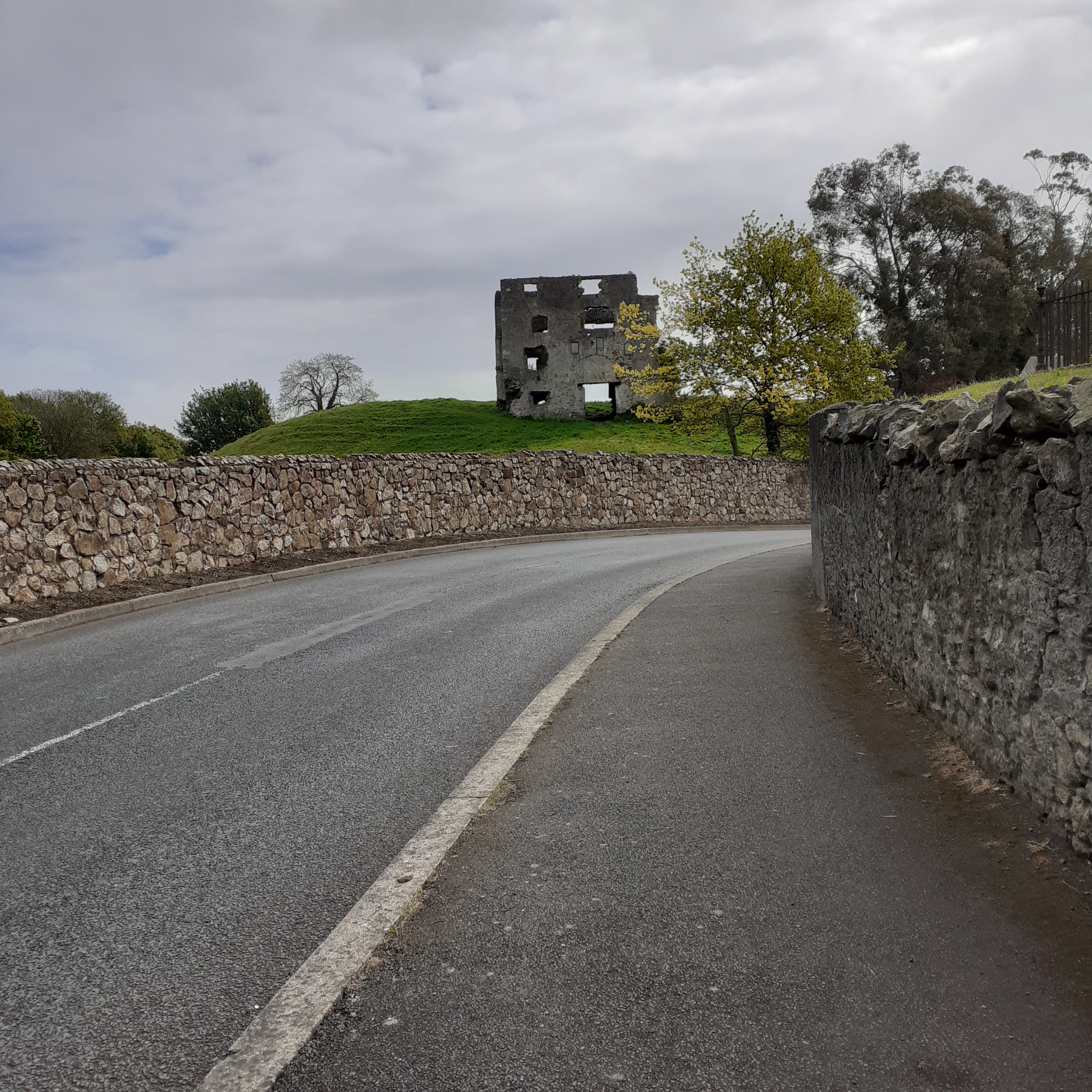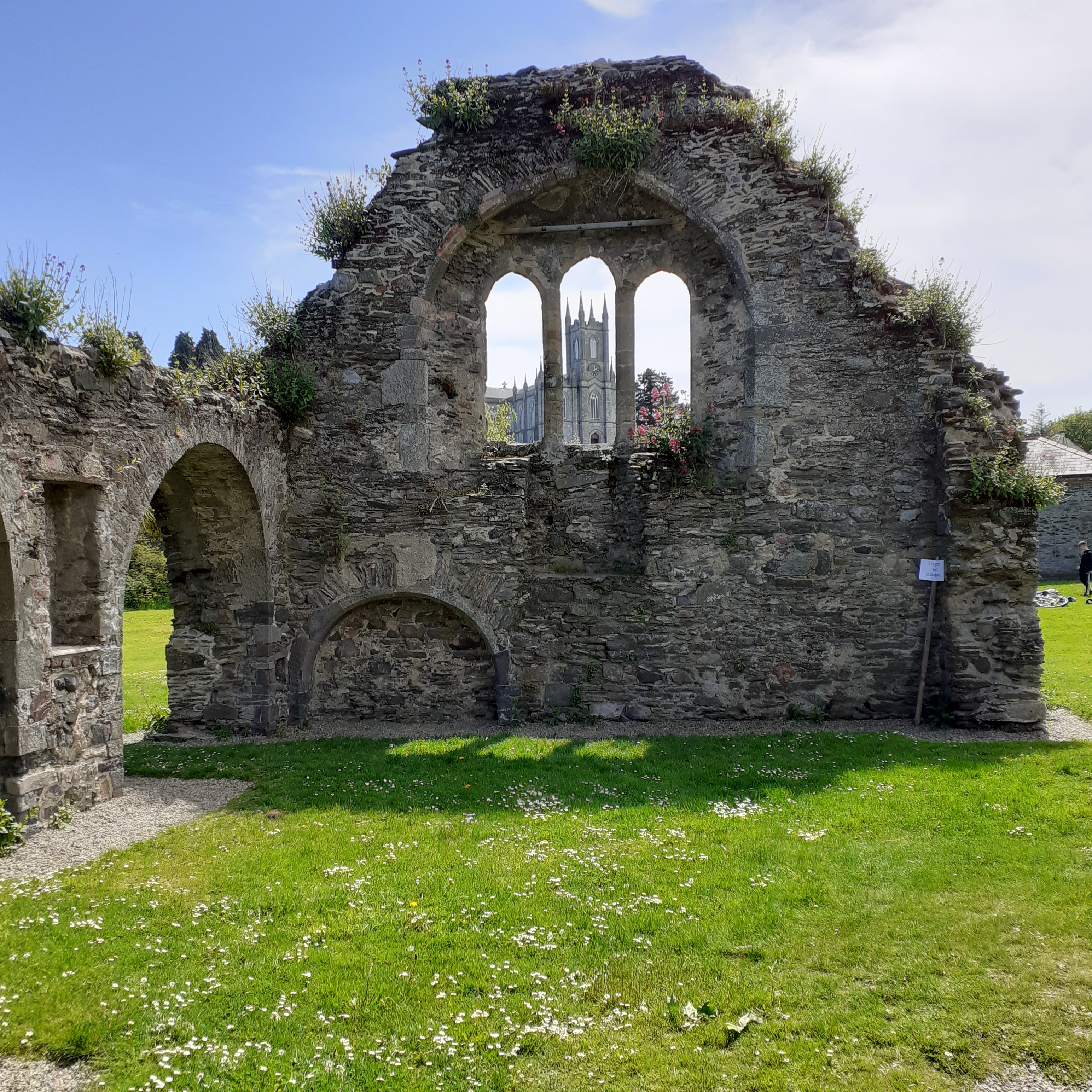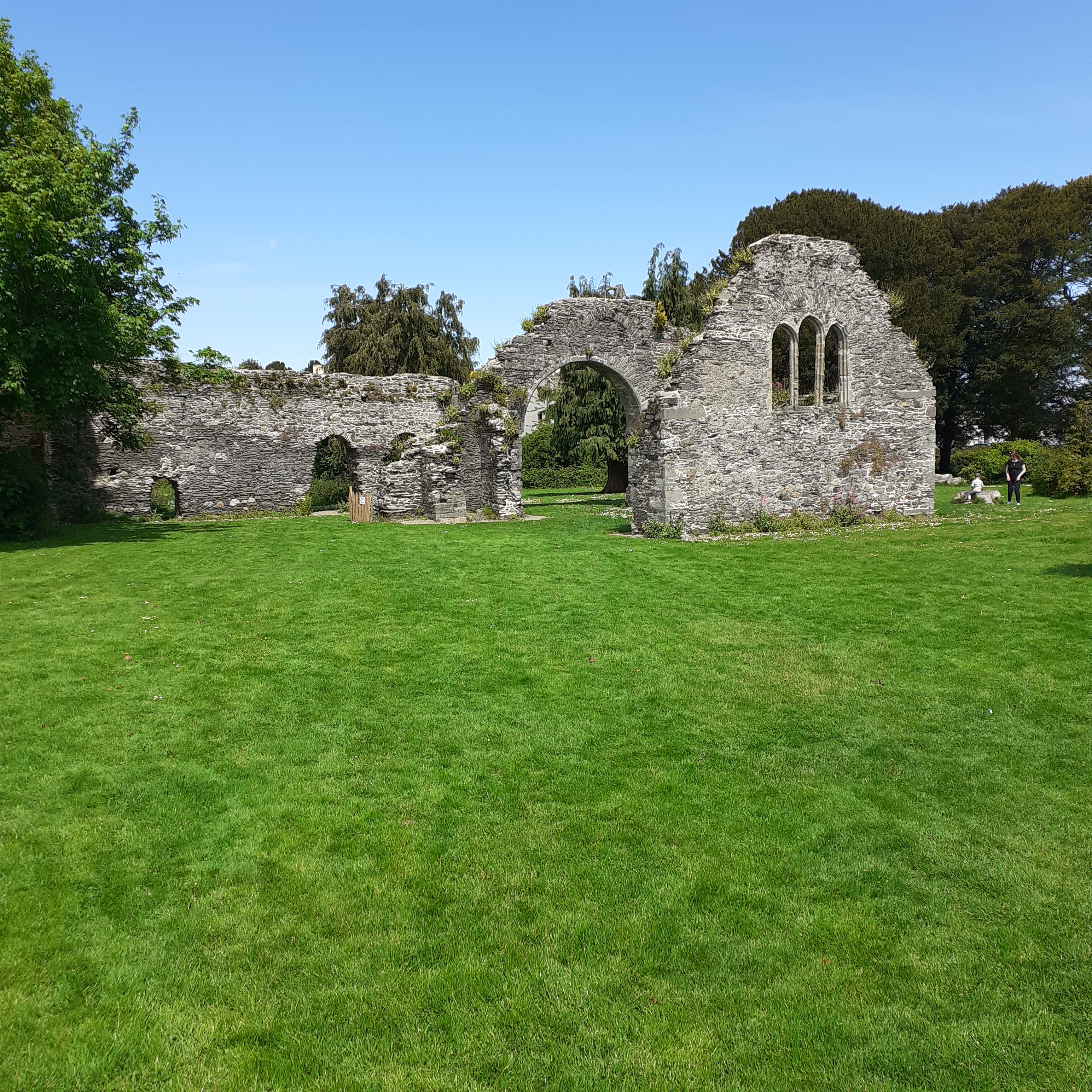 The Abbey Grounds are on our left hand side. This informal park is in the gardens of the Parochial House and include the picturesque ruins of the Franciscan Abbey. The abbey was founded in the mid thirteenth century during a brief hiatus when the local clans, the O’Byrnes and O’Tooles had ousted the Fitzgeralds. While temporal rulers continued their merry dance, the Franciscans presided for three centuries until the disastrous Dissolution of the Monasteries by Henry VIII. Although the Franciscans later attempted a comeback, they were ousted again by Cromwell and the Abbey, after a brief spell as a courthouse, fell into ruin. Visiting on a sunny day, I was struck by its harmony of beauty and sadness, also nearly by a football. Some kids were having a kickabout, with the girls nearby enjoying loud music. A woman with a buggy had found a quieter spot to read, and over all, the padre presided benignly from his chair outside the Parochial House.