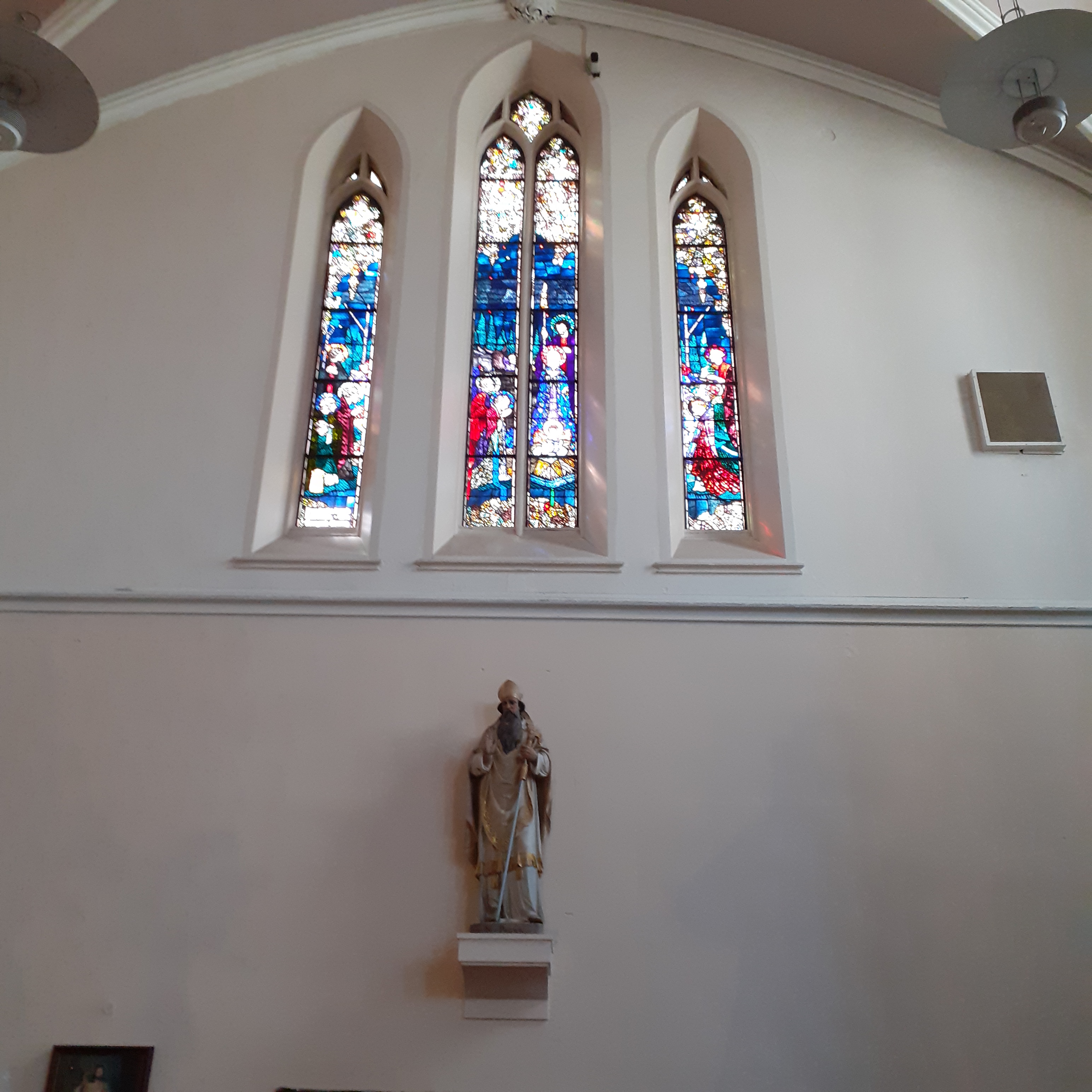 The vista is dominated by St. Patrick’s Church on the hill rising to the west of the town. A dramatic gothic structure, St Patrick’s was built in the 1840s. on land donated by the Fitzwilliams family. Dedicated to Ireland’s patron saint whose mission of conversion began here. Sandstone used in its construction was ironically transported from Skerries, where Patrick sought refuge after his hostile reception, bringing a neat conclusion to Wicklow’s ecclesiastic narrative. The church interior is pleasant, if plain, as in most Irish Catholic churches. Most interesting is the stained glass window in the west trancept by Harry Clarke, depicting the birth of Christ.
