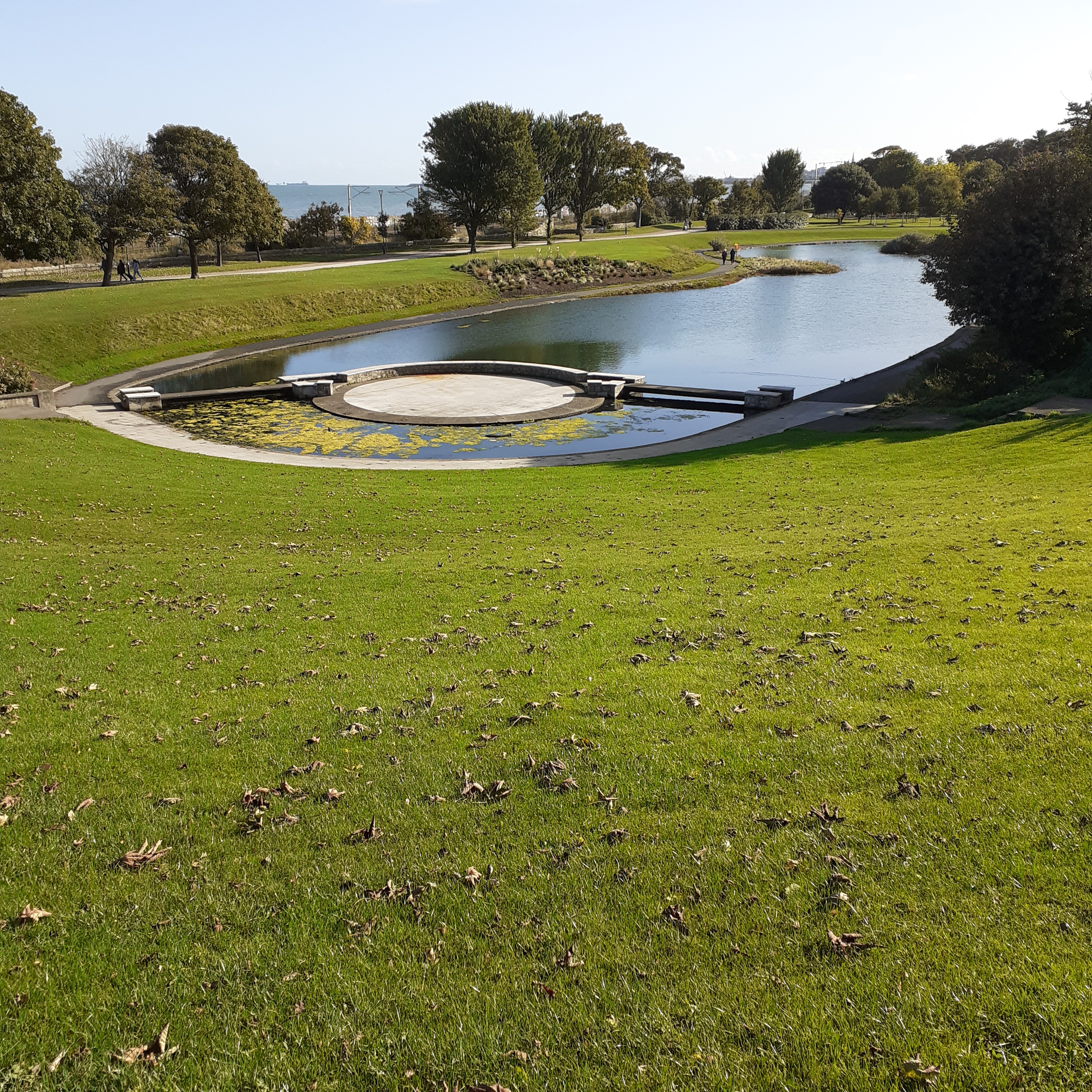 The ground plunges down to an attractive pond. This forms a naturalesque amphitheatre with the sloping green sward rising above the placid water. A small circular island provides an open bandstand. Time was, my friends and I would make our way here of a weekend, where we basked in those golden days with Thin Lizzy, Mellow Candle, Horslips, and, em, Chris De Burgh. That line up played here in August 1971.