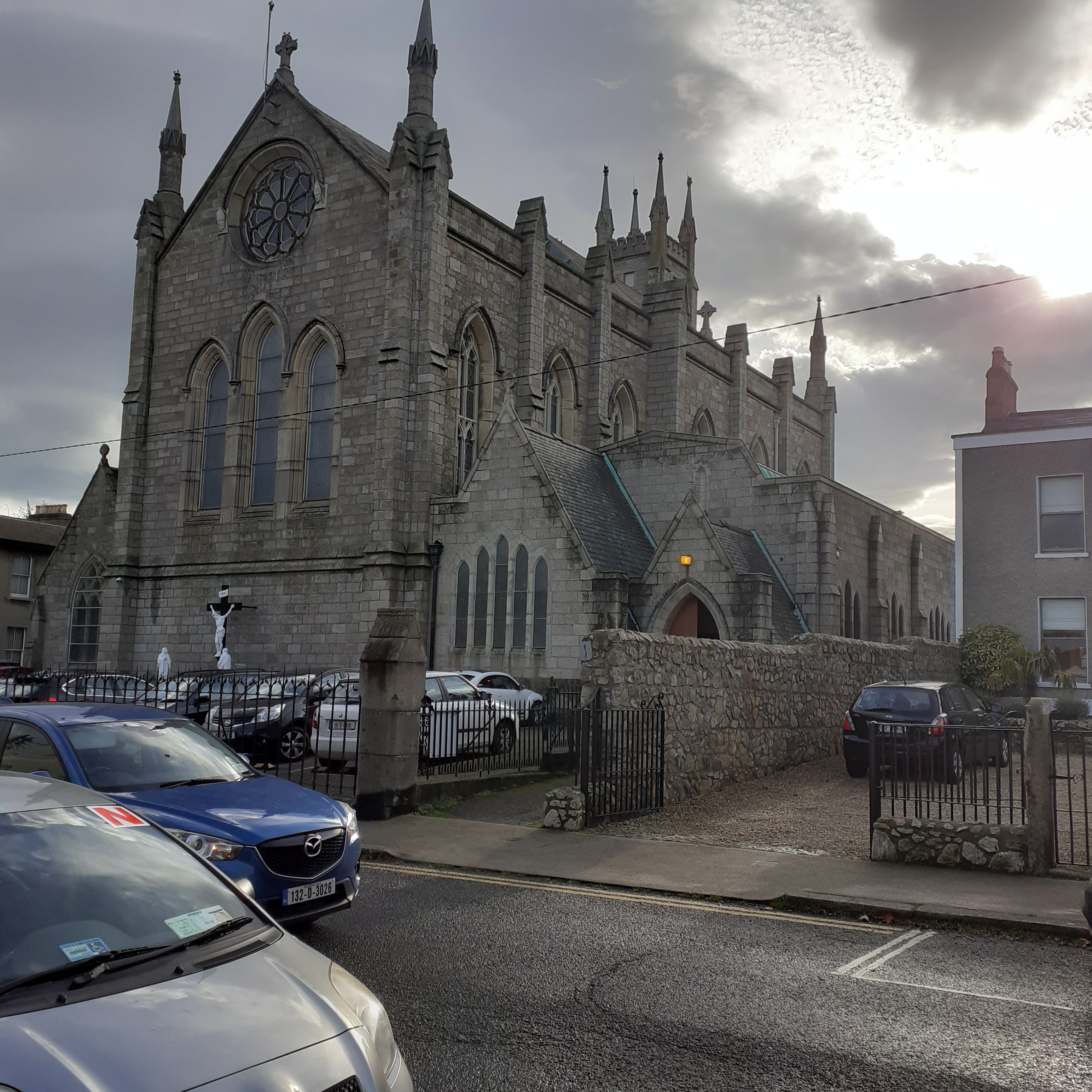 Main Street divides into Temple Road and Newtown Avenue. Along Temple Road, the right hand fork, we come across Blackrock Dolmen. This sculpture by Rowan Gillespie is evocative of ancient days and teeters near the entrance to the Church of Saint John the Baptist. The church was built in 1845 on land donated by Valentine Lawless and designed by Patrick Byrne, an early example of Gothic Revival, inspired by Augustus Pugin. The interior holds stained glass windows by Ireland’s two masters of the form, Harry Clarke and Evie Hone.