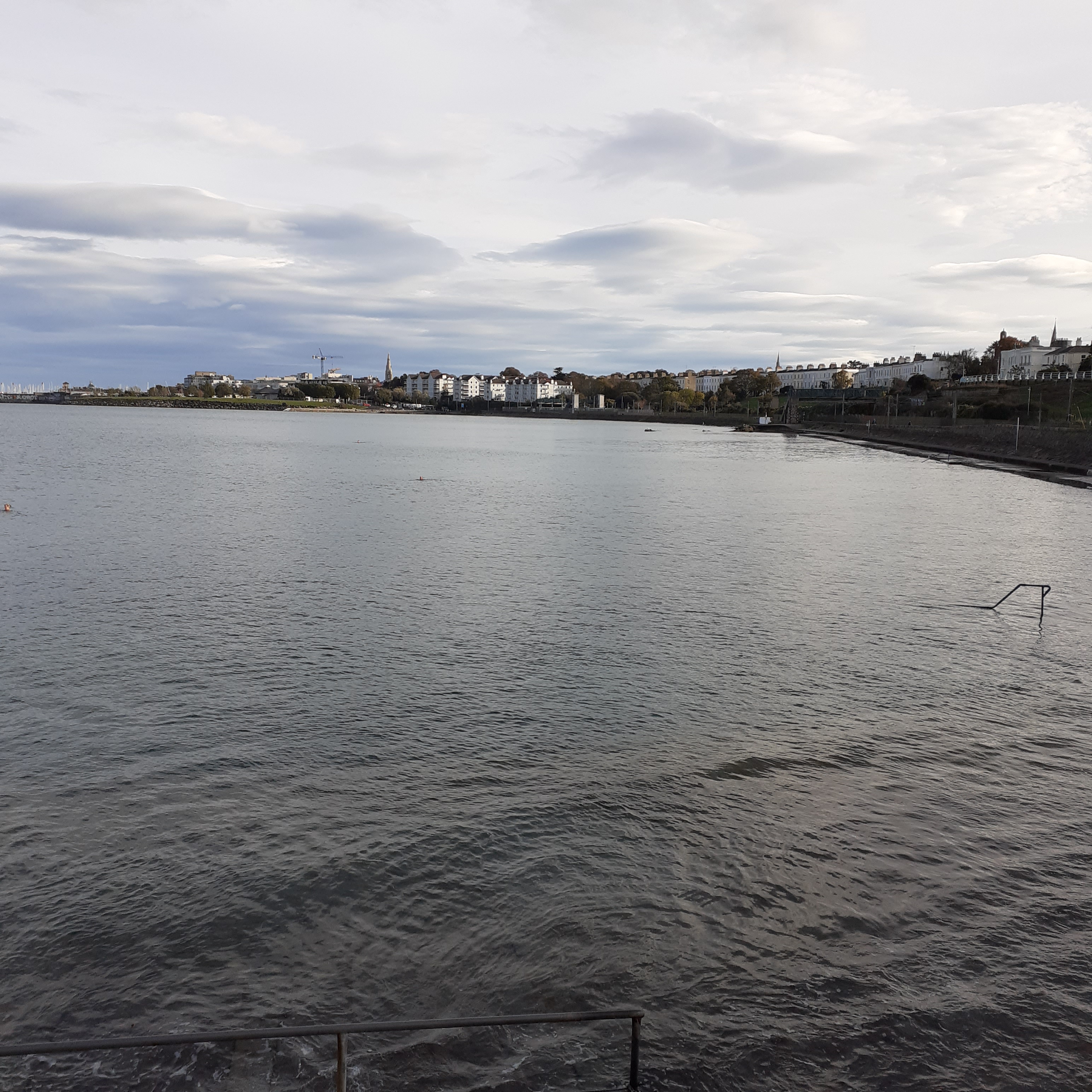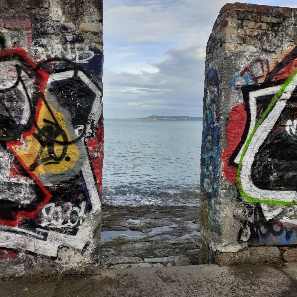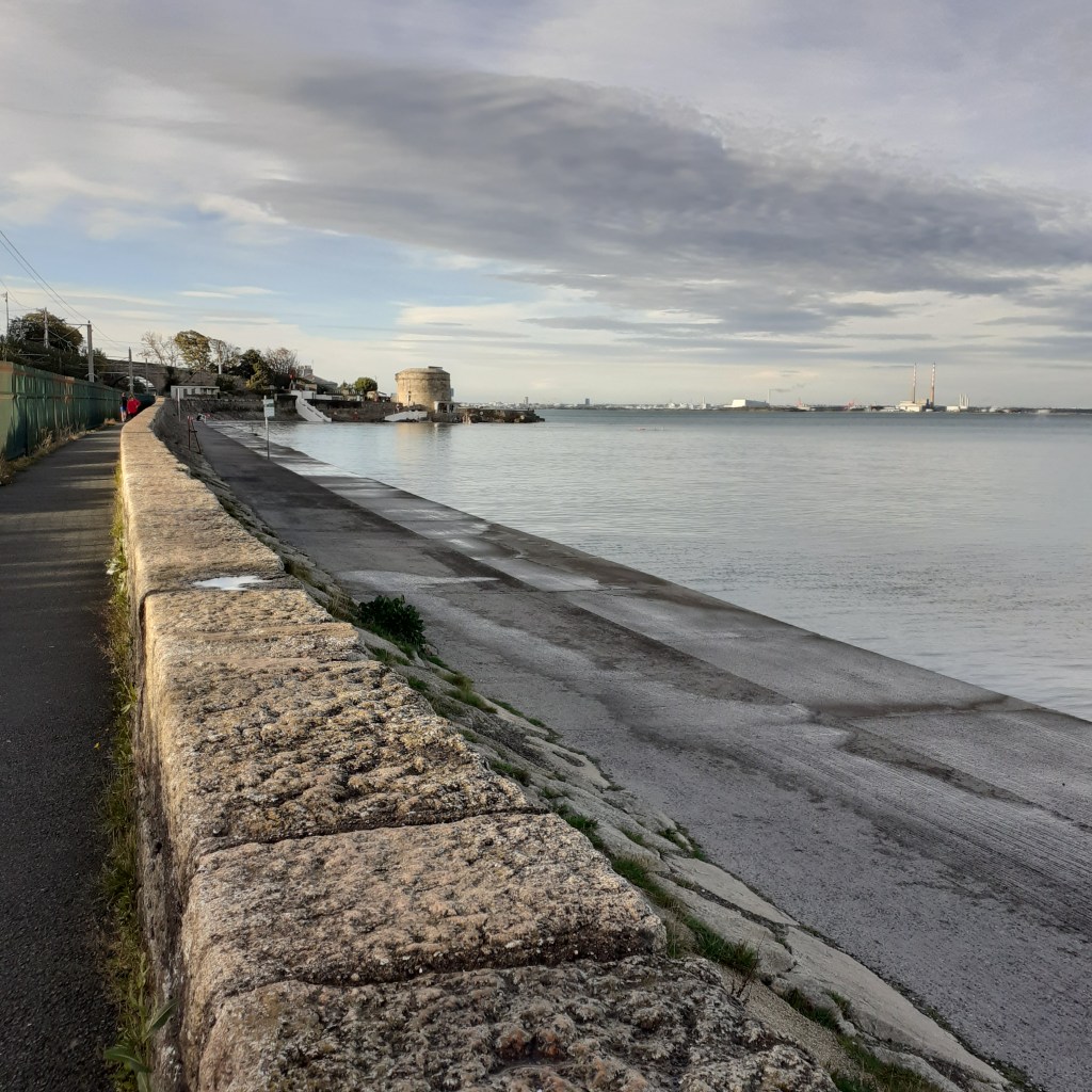 Newtown Avenue leads to a sharp dogleg right, to avoid running into the front porch of Newtown House. Blackrock House from 1774 is adjacent, distinguished by its two storey brick porch. The next sharp left takes us down Seapoint Avenue. There’s a narrow laneway leading to Seapoint station. This opened in 1860 when it was called Monkstown and Seapoint. To access the coast, take the next laneway on the left which leads down to Brighton Vale, a pleasant row of bungalows nestled on the shore. A few yards further on is Seapoint Martello Tower, overlooking the popular bathing place. From here the walkway curves along the lower lip of Dublin Bay to its end.