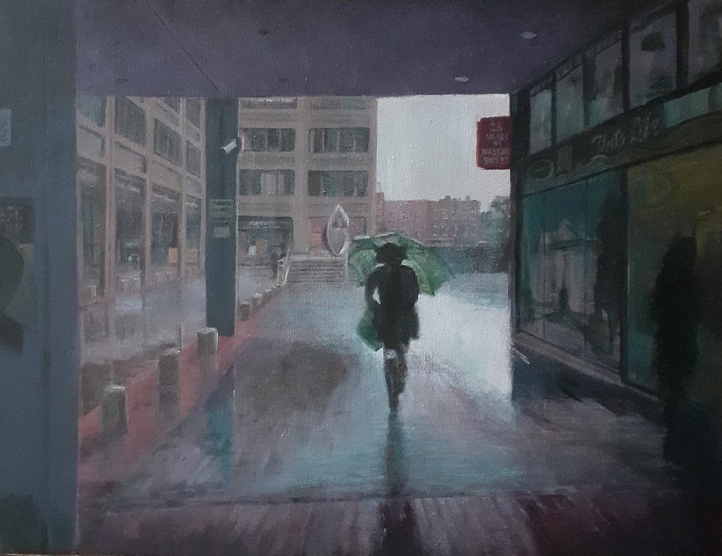 This painting describes a wet day entering Setanta’s concourse from Nassau Street. There is an echo of the painting The Wanderer, by German gothic romantic artist Caspar David Friedrich. Friedrich’s tableau depicts a silhouette poised before the aching beauty of nature. My wanderer carries an umbrella before her like a shield. But cities in the rain, even in their plainest raiment, are jewels to behold, whether rough diamonds or polished just so.