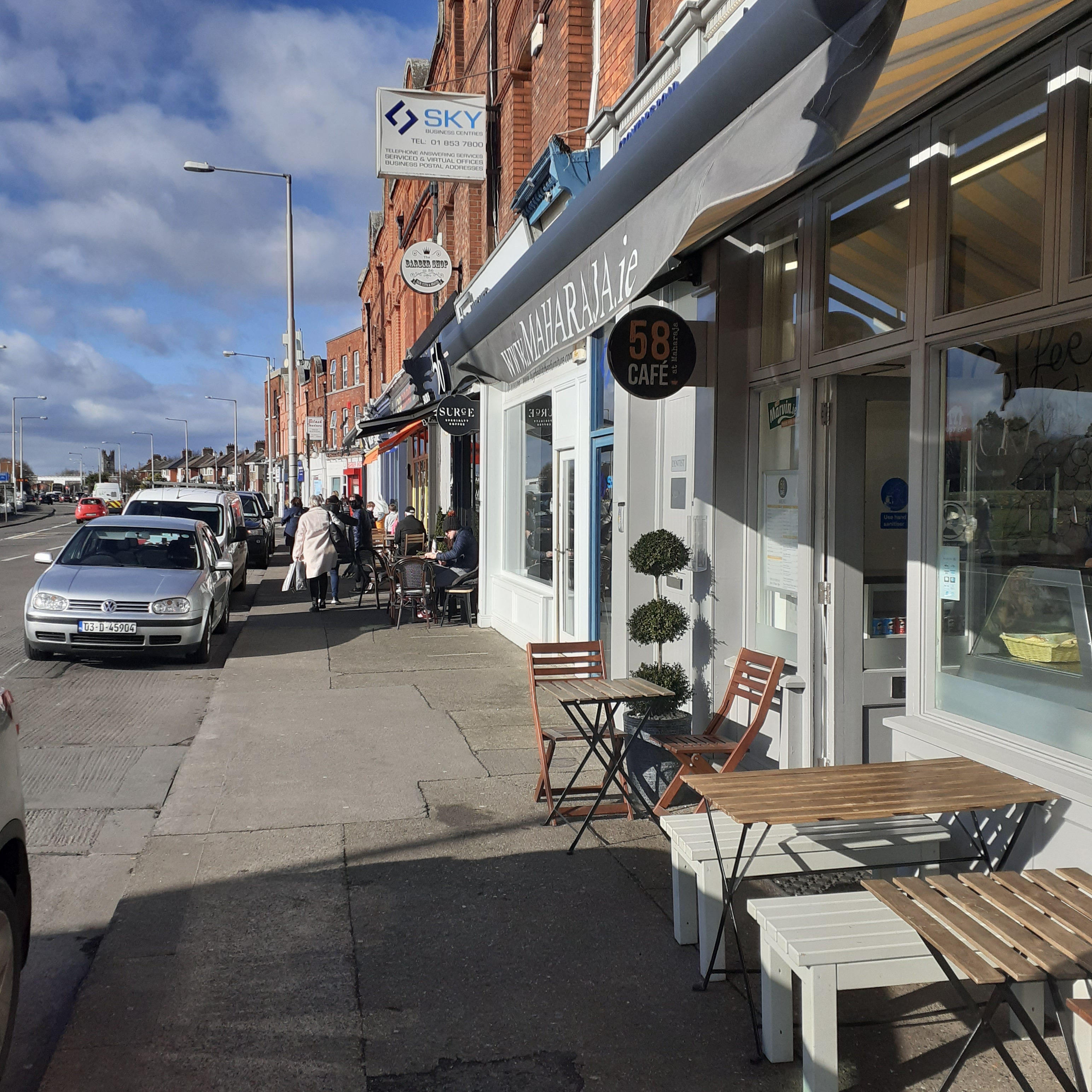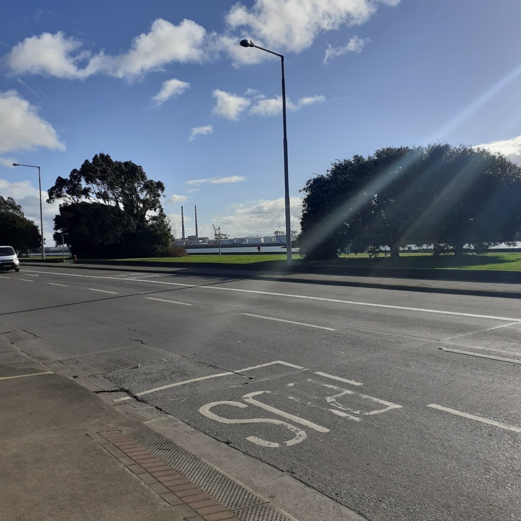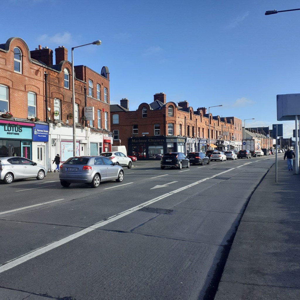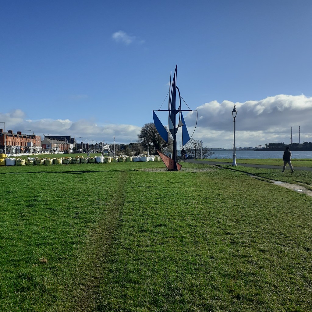 Escaping the station, one is rewarded with a nexus of parkland and seafront promenade. To our left lies Fairview Park and Marino which we’ve recently explored. To our right, the road curves along the coast with the well-to-do suburb of Clontarf inland, and a pleasant linear park laid out on the seaward side. It’s similar to the coastal stretch on the southside at Sandymount. Across the water we see industrial East Wall and Dublin Port and Docks, and a bit further, the dominant striped towers of the Pigeon House and the Incinerator on the South Bull. An urban streetfront of red brick two and three storey premises continues as far as St Lawrence Road and the Yacht bar and restaurant. Cafe society clings to the pavement, an uneasy but distinctive mix of environments; city street and seafront.