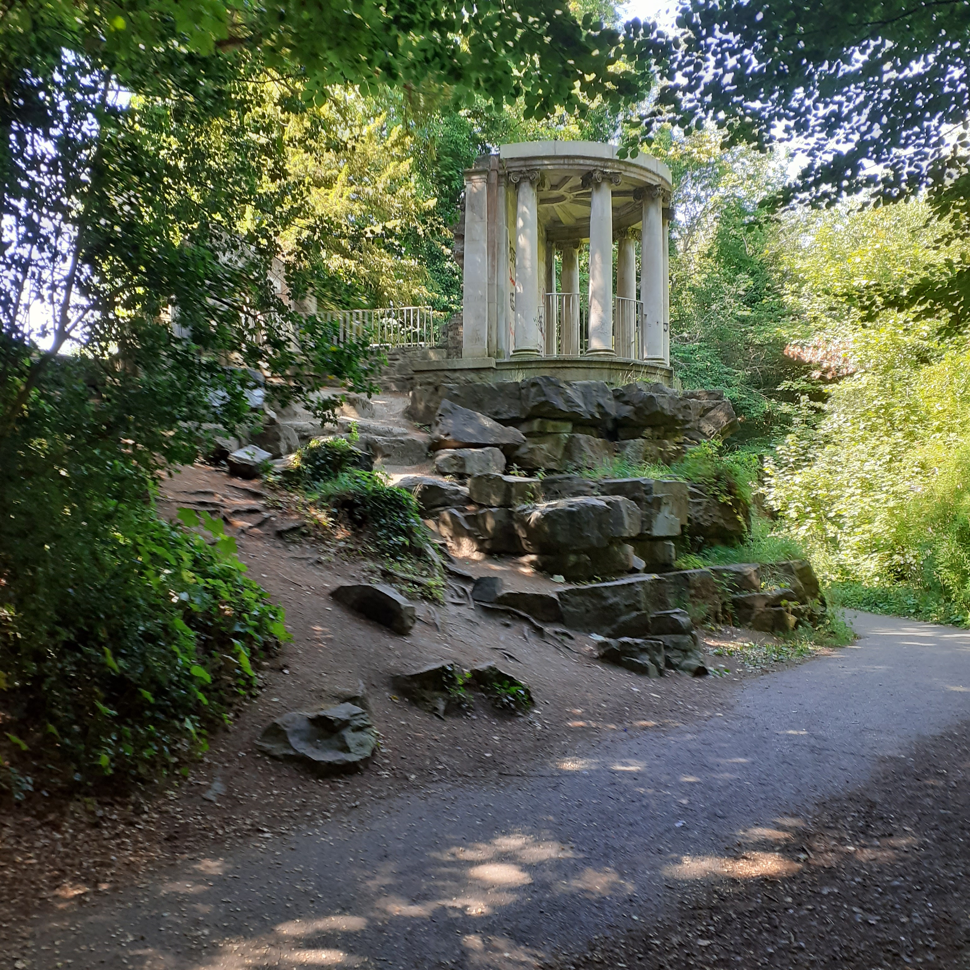 The Herculanean Temple is one of a number of follies with a Roman theme The temple of Isis by the pond nearby takes its inspiration from Pompeii. The false ruins would make an ideal backdrop for a Romantic painting, with cavorting heros and nymphs. Today, two Goth couples lounge by the water smoking the herb. So, more of a Manet then. My journey becomes ever more winding, and I eventually gain the seafront across an Impressionist meadow.