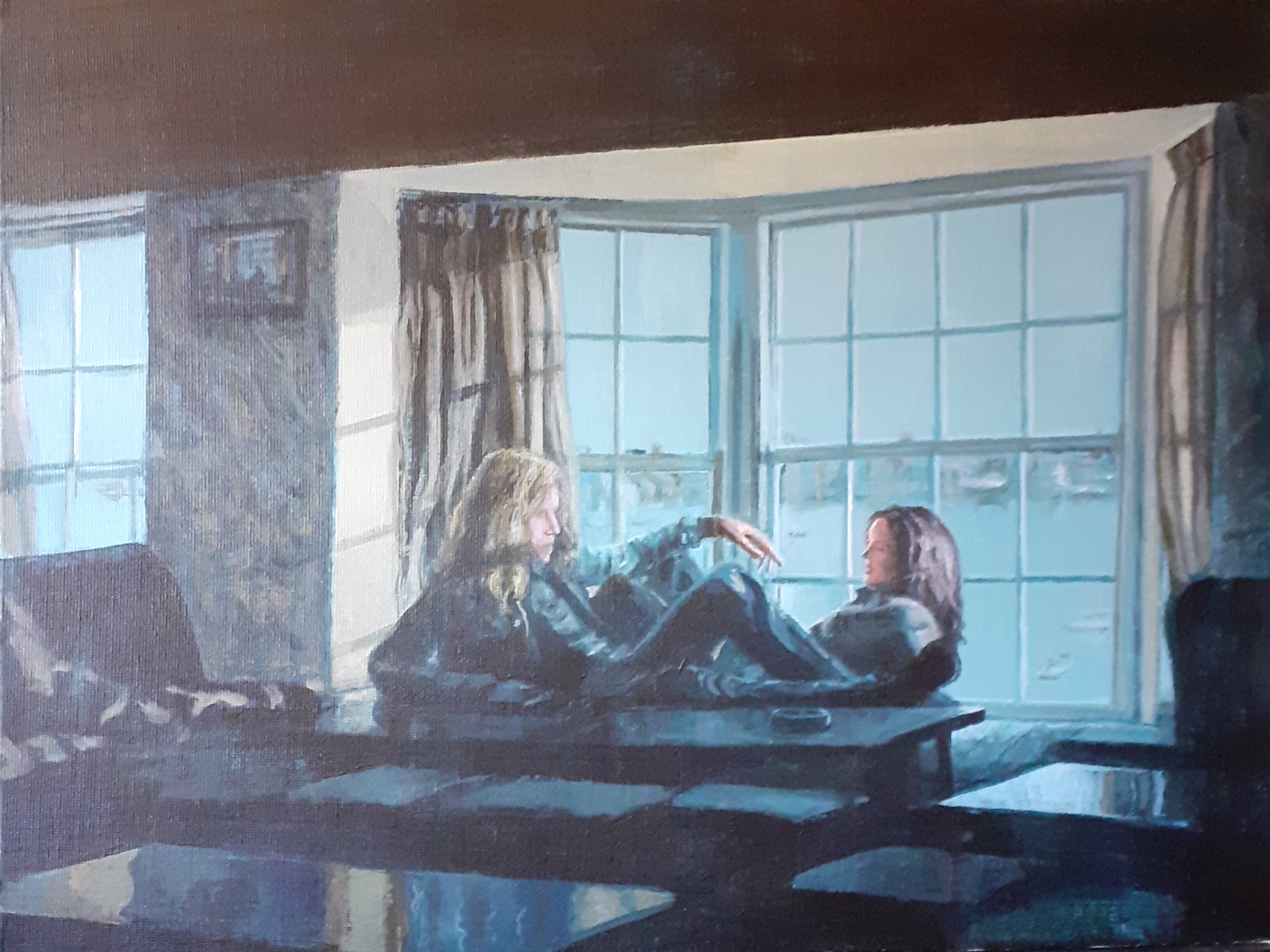 This acrylic on board is based on a photograph. The photo was taken by M on a trip, many moons ago, to Skerries in North Dublin. Four of us found ourselves in Joe Mays which is located on the harbourfront and dates back to 1865. The upstairs lounge has fine views over the harbour. It was empty and dark, but strangely flooded with sunlight. We disported ourselves in the bay window and thought, in high spirits, to enact some Renaissance tableau, as you do. M arranged the scene with myself and our friend J. We were thinking of Venus and Mars. M is also known as Mars, which shuffles the roles slightly. Since we were having fun there’s no point in being too interpretative. The shoot would have called up a few references but this was the shot that worked best. Almost fifty years later the main thing it conjures up for me is our youth, and all that entails.