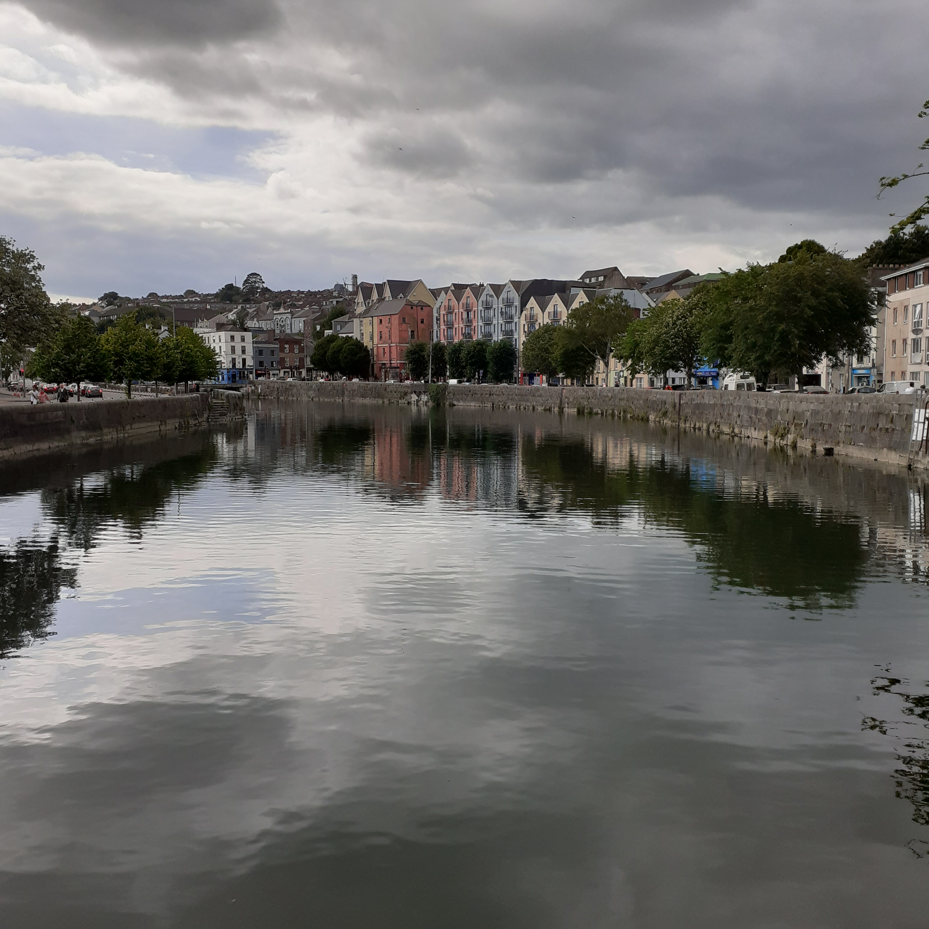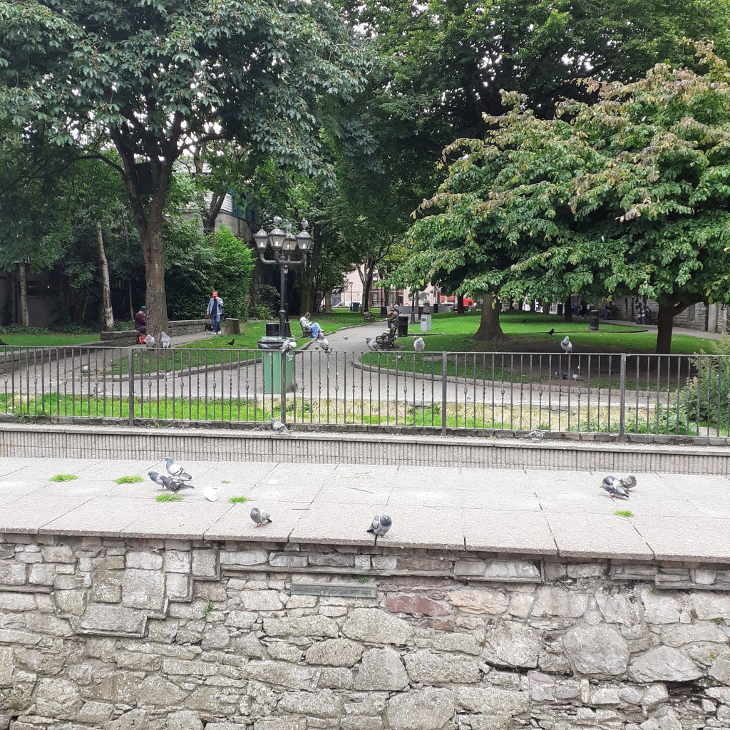 Patrick Street loops to an end at Grand Parade which is broad and straight. Like Patrick Street, it was once a water channel, the ancient settlement of Cork growing up on its west bank. Evening rush hour was approaching so we stopped for coffee and a snack at a place nearby, the Bean and Leaf, with a pleasant terrace from which to watch the world go by. On the far bank is Bishop Lucy Park, with remnants of the medieval citywall visible inside the entrance. It’s one of few parks in the city centre and dates only to 1985, when it was built to celebrate eight hundred years of city status. Around that time, myself and M holed up in Cork again at the end of a significant adventure.