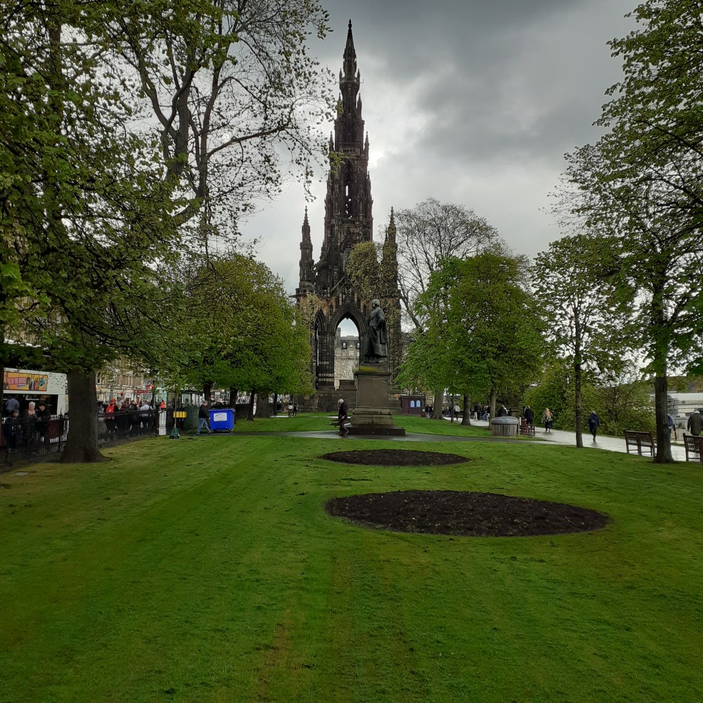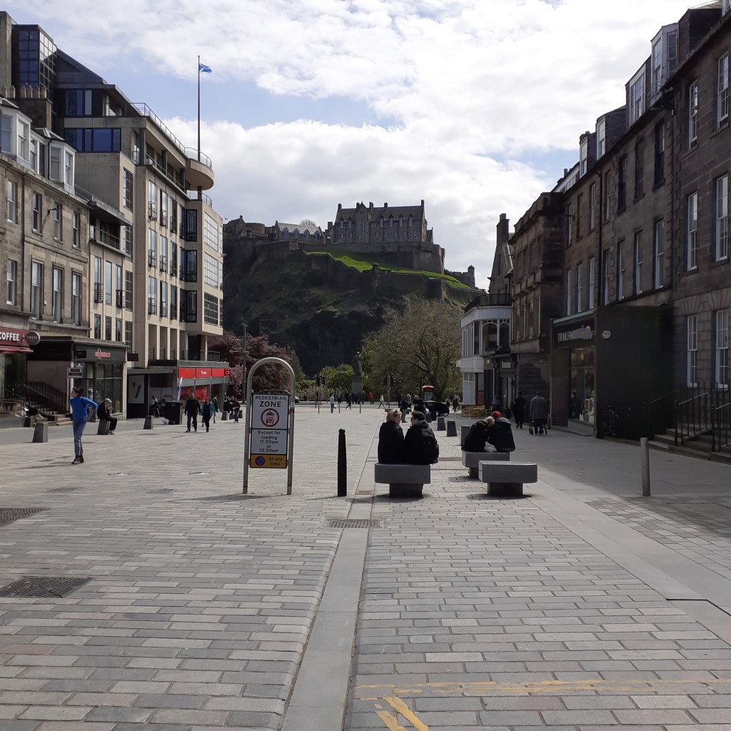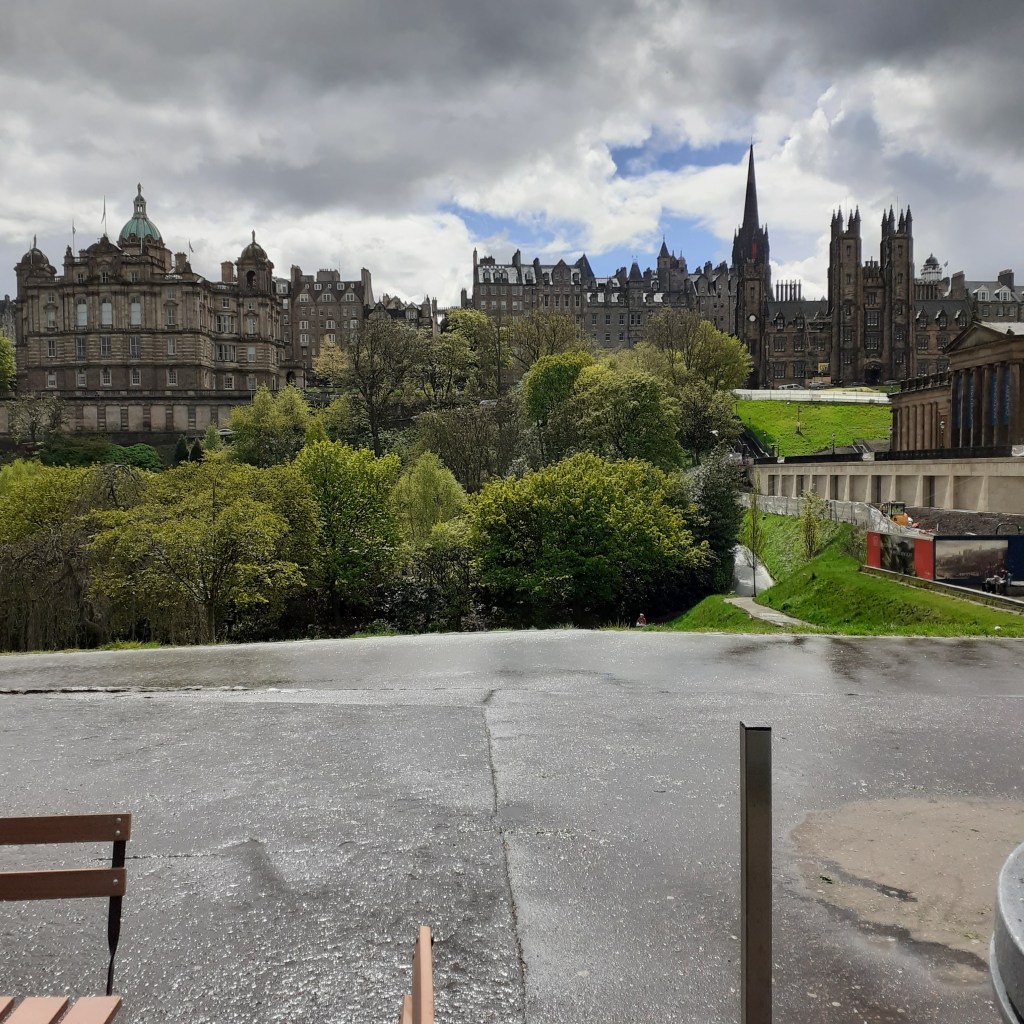 Outside, I take in the atmosphere in the traditional manner before heading south along Castle Street. Rose Street, reminds me of Cork’s Oliver Plunkett Street, narrow, straight, cobbled and quaint.It’s pedestrianised and a busy mix of shops, cafes and bars. Abbotsford is at the eastern end. Named for the home of Sir Walter Scott in the Borderlands to the south. The pub is an Edwardian saloon, well upholstered beneath an ornate ceiling and around an imposing mahogonay island bar. There’s a restaurant upstairs. I order a Tennents, frothy and longlasting, the gift that keeps on giving. The bar is busy and I take my drink onto the terrace where I can catch the suns afternoon rays. A nearby busker rests his back against the railings of Rose Street Garden. This open air cafe and wine bar is a popular celbrity haunt. It les at the back of The Dome on George Street, a neo-classical building from 1847, once a bank and now a chic restaurant. Back on my stretch of pavement, more are following my lead in taking the air. It’s most pleasant. The busker’s repertoire is Dylanesque, with a tartan weave that includes The Proclaimers amongst others. He’s giving it the full nine yards, and might be better dialling it down a bit. I wonder should I ask him to sing Faraway.