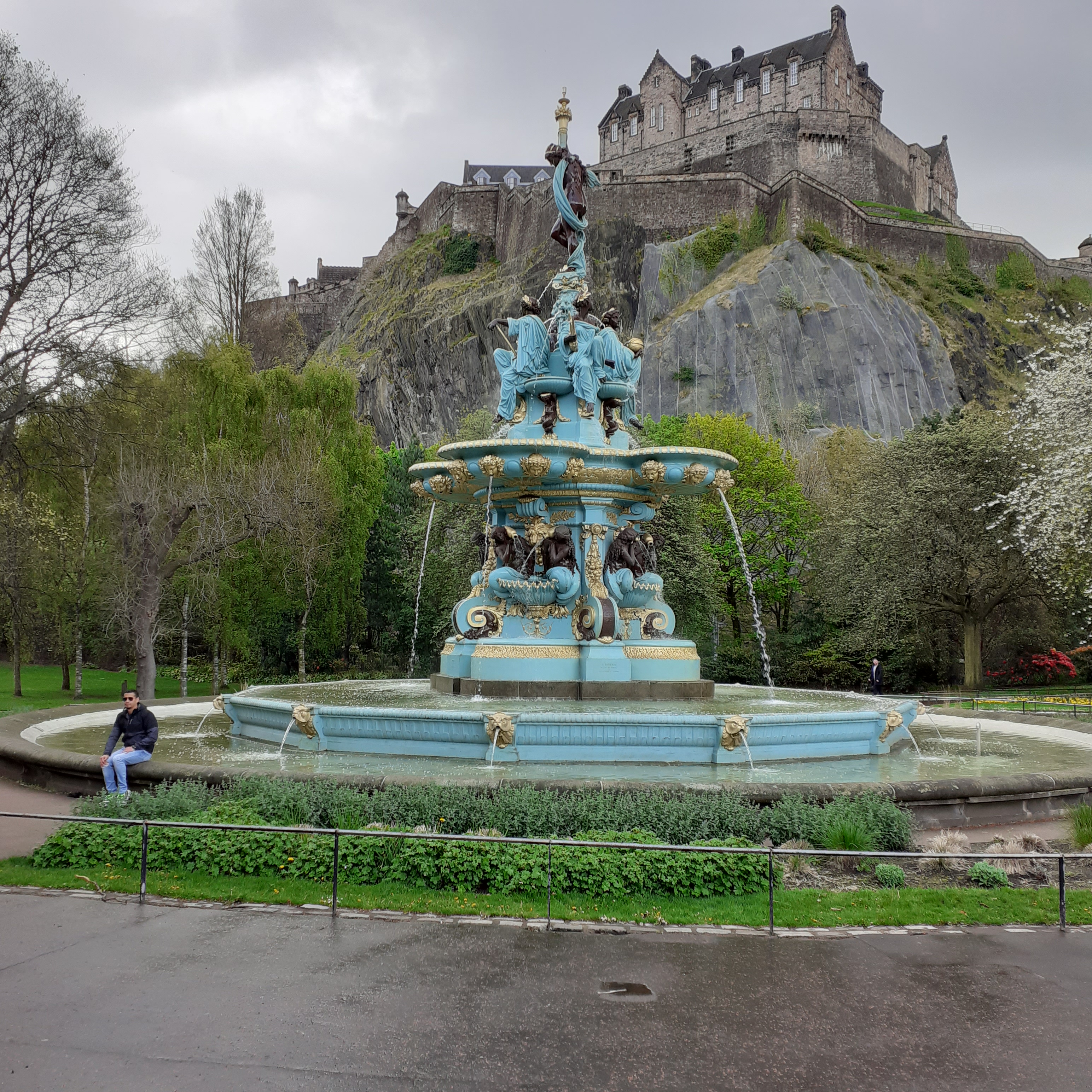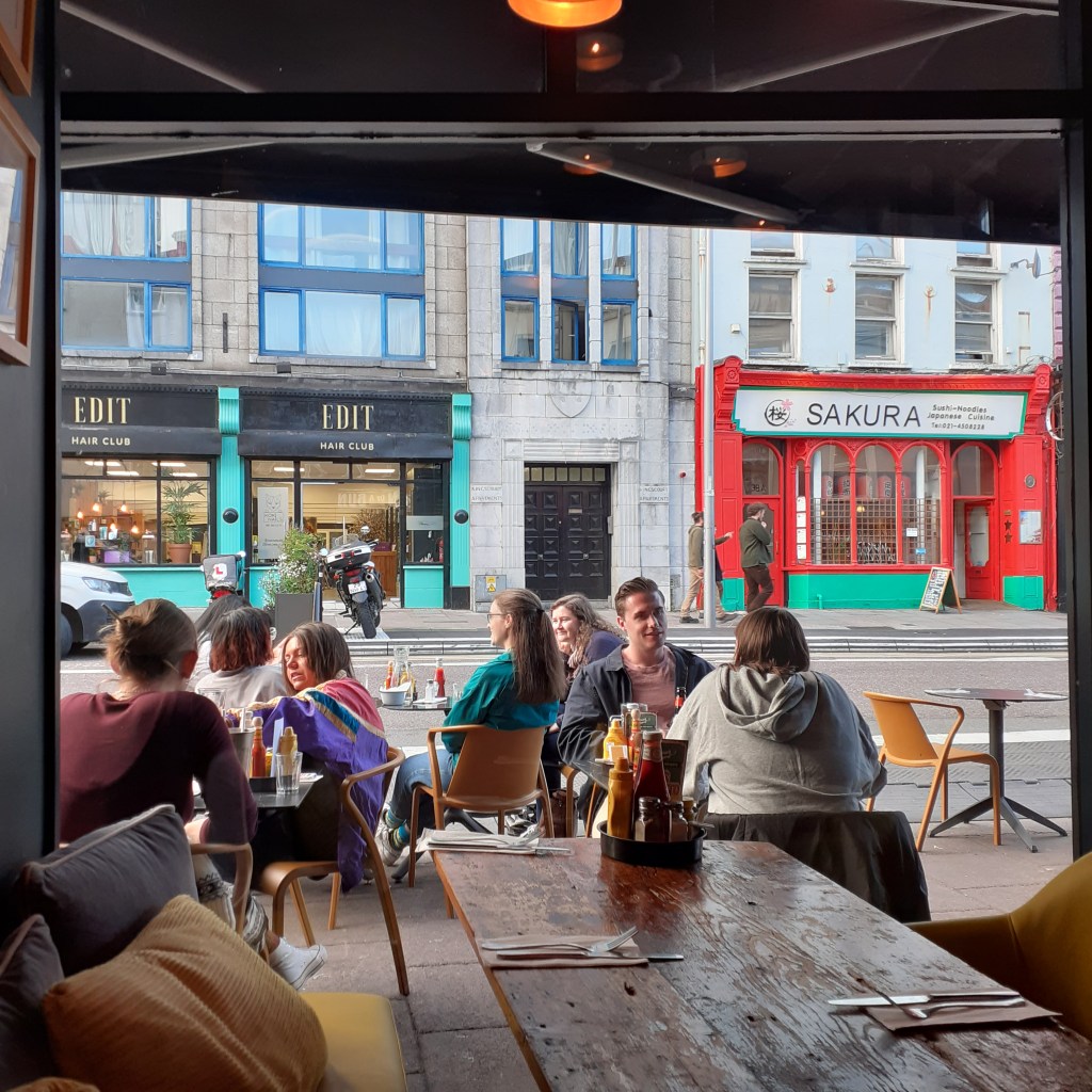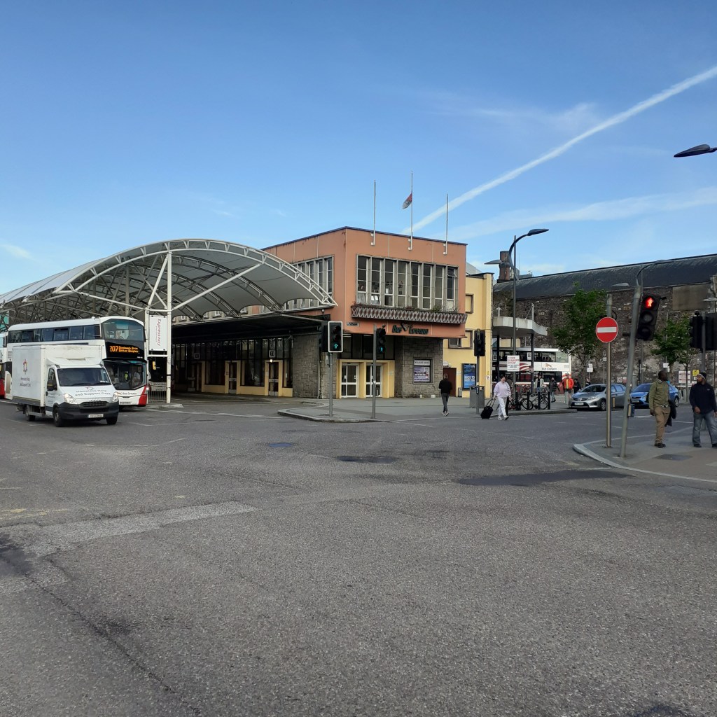 Outside, I take in the atmosphere in the traditional manner before heading south along Castle Street. Rose Street, reminds me of Cork’s Oliver Plunkett Street, narrow, straight, cobbled and quaint.It’s pedestrianised and a busy mix of shops, cafes and bars. Abbotsford is at the eastern end. Named for the home of Sir Walter Scott in the Borderlands to the south. The pub is an Edwardian saloon, well upholstered beneath an ornate ceiling and around an imposing mahogonay island bar. There’s a restaurant upstairs. I order a Tennents, frothy and longlasting, the gift that keeps on giving. The bar is busy and I take my drink onto the terrace where I can catch the suns afternoon rays. A nearby busker rests his back against the railings of Rose Street Garden. This open air cafe and wine bar is a popular celbrity haunt. It les at the back of The Dome on George Street, a neo-classical building from 1847, once a bank and now a chic restaurant. Back on my stretch of pavement, more are following my lead in taking the air. It’s most pleasant. The busker’s repertoire is Dylanesque, with a tartan weave that includes The Proclaimers amongst others. He’s giving it the full nine yards, and might be better dialling it down a bit. I wonder should I ask him to sing Faraway.