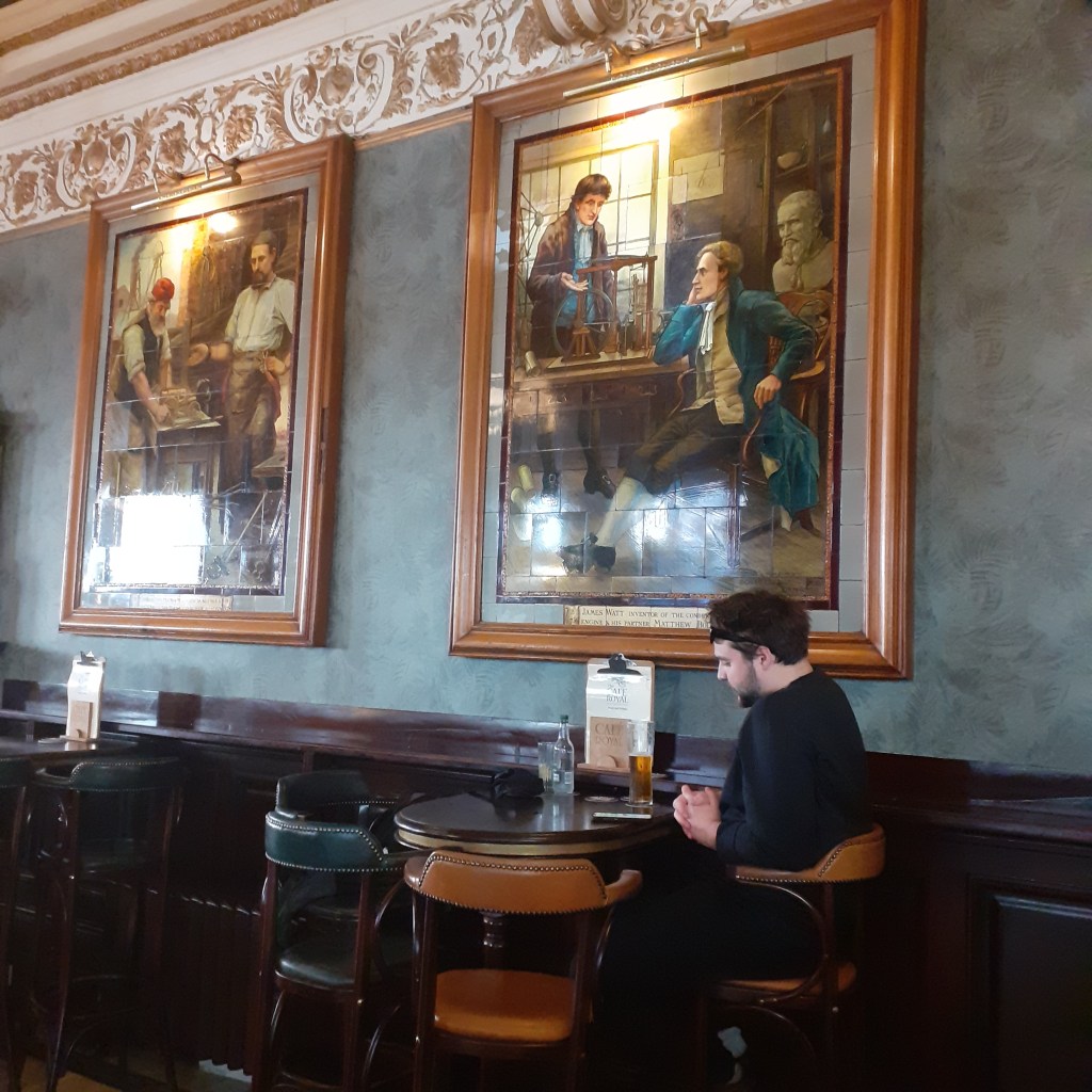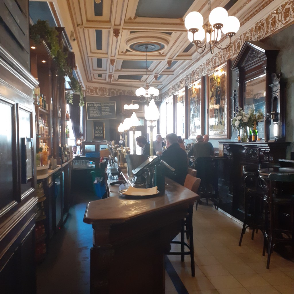 Number three on the list is the Cafe Royal. This is beyond St Andrew’s Square on a secluded side street. The Cafe Royal is a lovely Victorian bar with towering glass windows designed by Architect Robert Paterson.from 1863. It describes itself as an Oyster Bar. Though shellfish is poison to me, there are more edible alternatives including haggis, venison and other Scottish delights. The walls are adorned with glorious ceramic tiled panels by John Eyre and stained glass windows featuring famous inventors such as James Watt. I can imagine myself in an age of elegance, amongst the gleaming brasswork and gasslamps. Prince’s Street is just a block away, abuzz with the height of the tea time rush. But here is a place to shelter from the outdoors, however benign, and bask in the glow of crafted opulence, art and intimacy; and a fine malt whisky, of course.