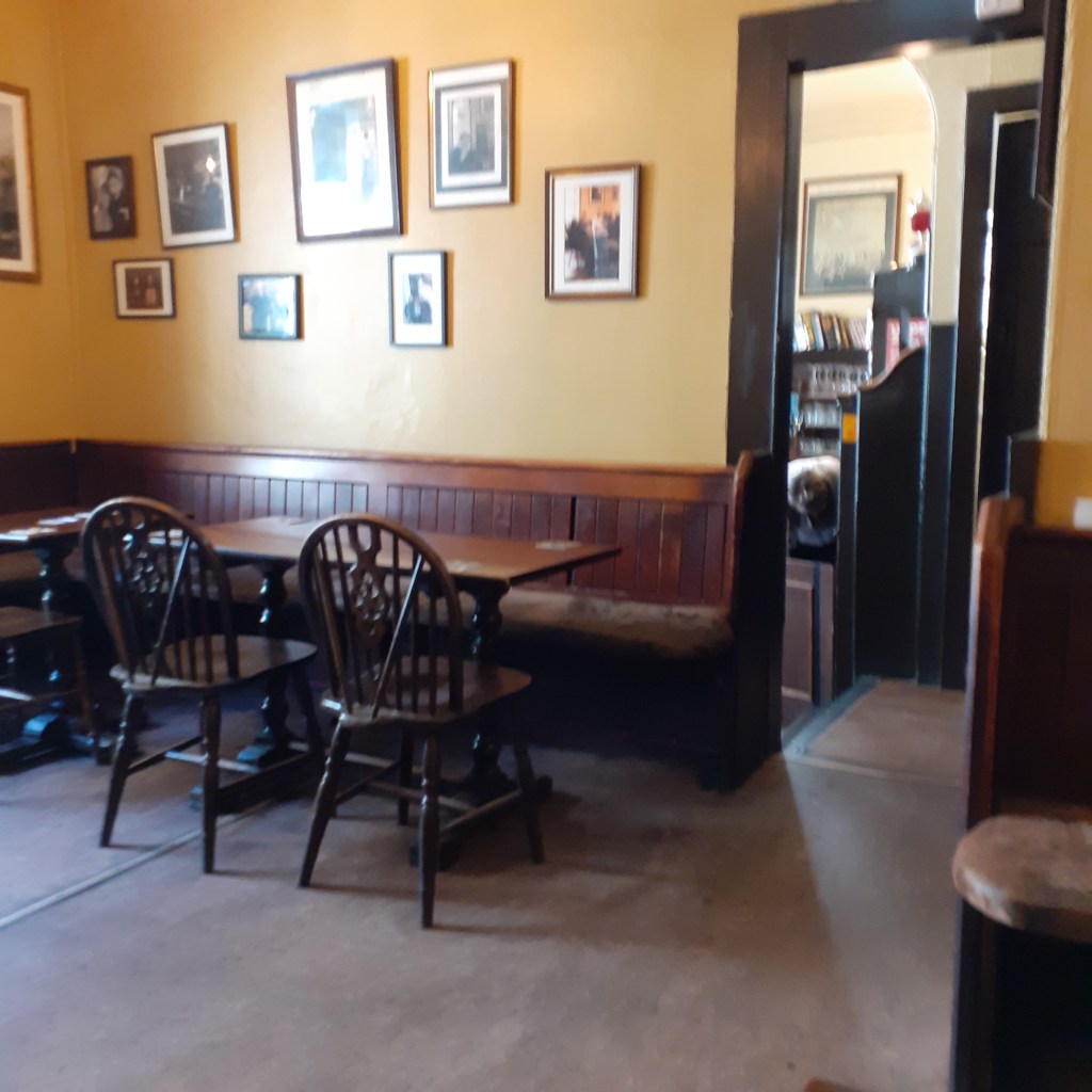 The Oxford Bar is well hidden, an oasis in a cramped enclave of grey brick on narrow Young Street, north of George Street. It dates back to 1811 and retains the intimate structure of its origins. There’s a tiny bar inside the entrance, a few steps up to a larger room to the rear sparsely furnished in gloomy wood, aglow with honeyed daylight through the sandblasted Oxford window. It’s there I take my pint of IPA and sit as if in a sepia photograph, my only company the solid beam of sunlight, and a man reading a novel by its light. It’s a literary pub, to be sure. I noticed Robbie Burns presiding over the bar as I ordered my Deucher’s. The photo gallery features musicians and others, but most notably Rankin himself (natch). I see too that Colin Dexter is a noted visitor. On the way out, I receive a bookmark or two as souvenir from the pleasant landlady who served me,