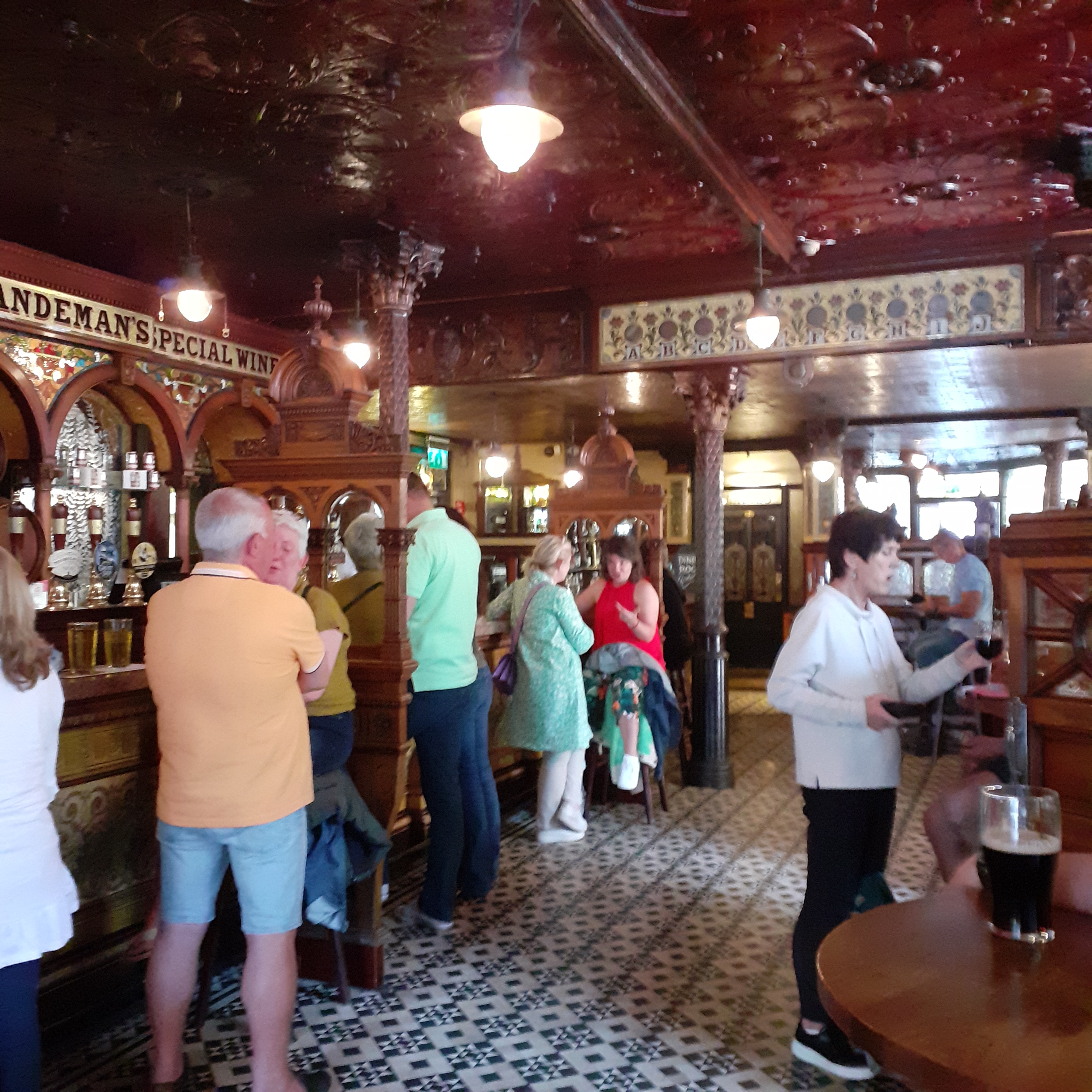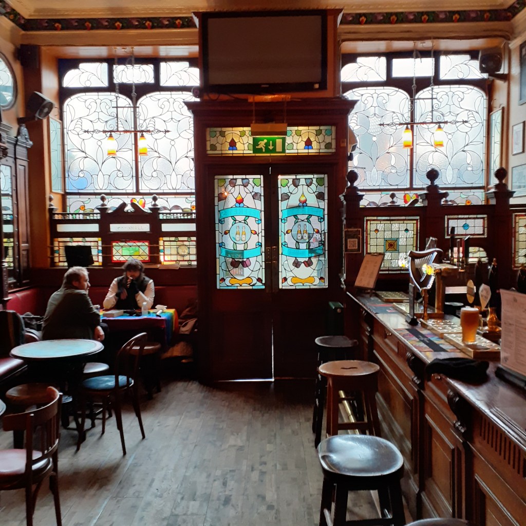 Meanwhile, the pub was renovated and renamed the Crown in 1885. It was conceived as a Victorian gin palace, as the lavishly ornate bars of the era were known. Publican Patrick Flanagan employed Italian craftsmen who were engaged in the construction of Catholic churches, enjoying a boom in Belfast at that time. The Italians certainly stamped the Crown with their exuberance. The colourful tiled exterior is eye catching and the effect continues in the glowing interior, also decorated with tiles and illuminated by gas lamps. Stained glass partitions separate a total of ten snugs with original antique fittings. So it was that we three amigos collapsed into the Crown and took possession of a snug.