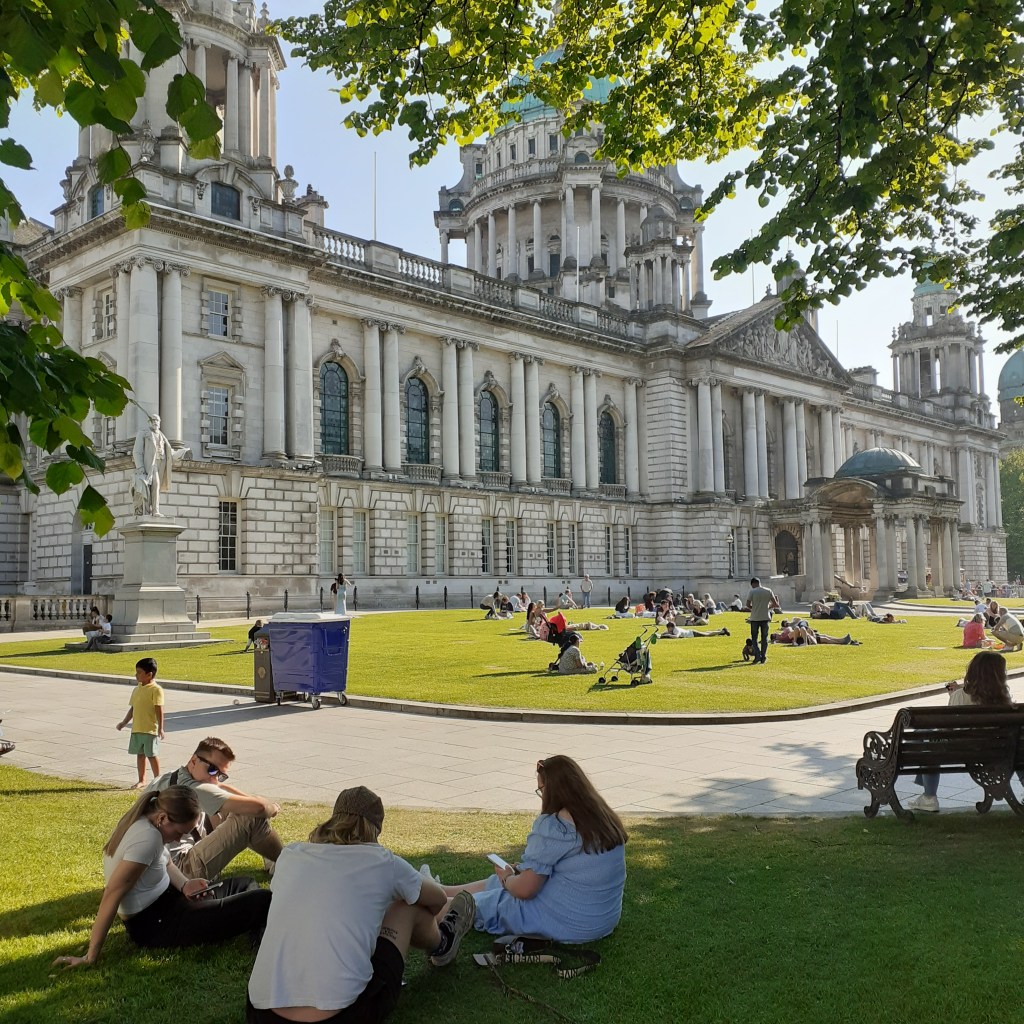 The City Hall and grounds occupies Donegall Square, named in honour of the Chichester family, founders of the city. Arthur Chichester was made Earl of Donegall in 1647 and the family castle once stood nearby. The county itself is now spelt with one l: Donegal. The building was designed by Alfred Brumwell Thomas, an English architect. Completed in 1906 it is faced in white Portland stone, a shining palace in Neo Baroque style. There are echoes of the phanthom fortress long gone, with a tower in each corner and a soaring copper dome capping the centrepiece column. The grounds are strewn with monuments to Queen Victoria (again), Edward James Harland of shipyards fame and those who sailed on the Titanic. There is also the Garden of Remembrance and Cenotaph. The extensive lawns accomodate the public. They are out in force on this most glorious of days, but can relax here on any day, to take the sunsine and forget such cares that life, and history can bring.