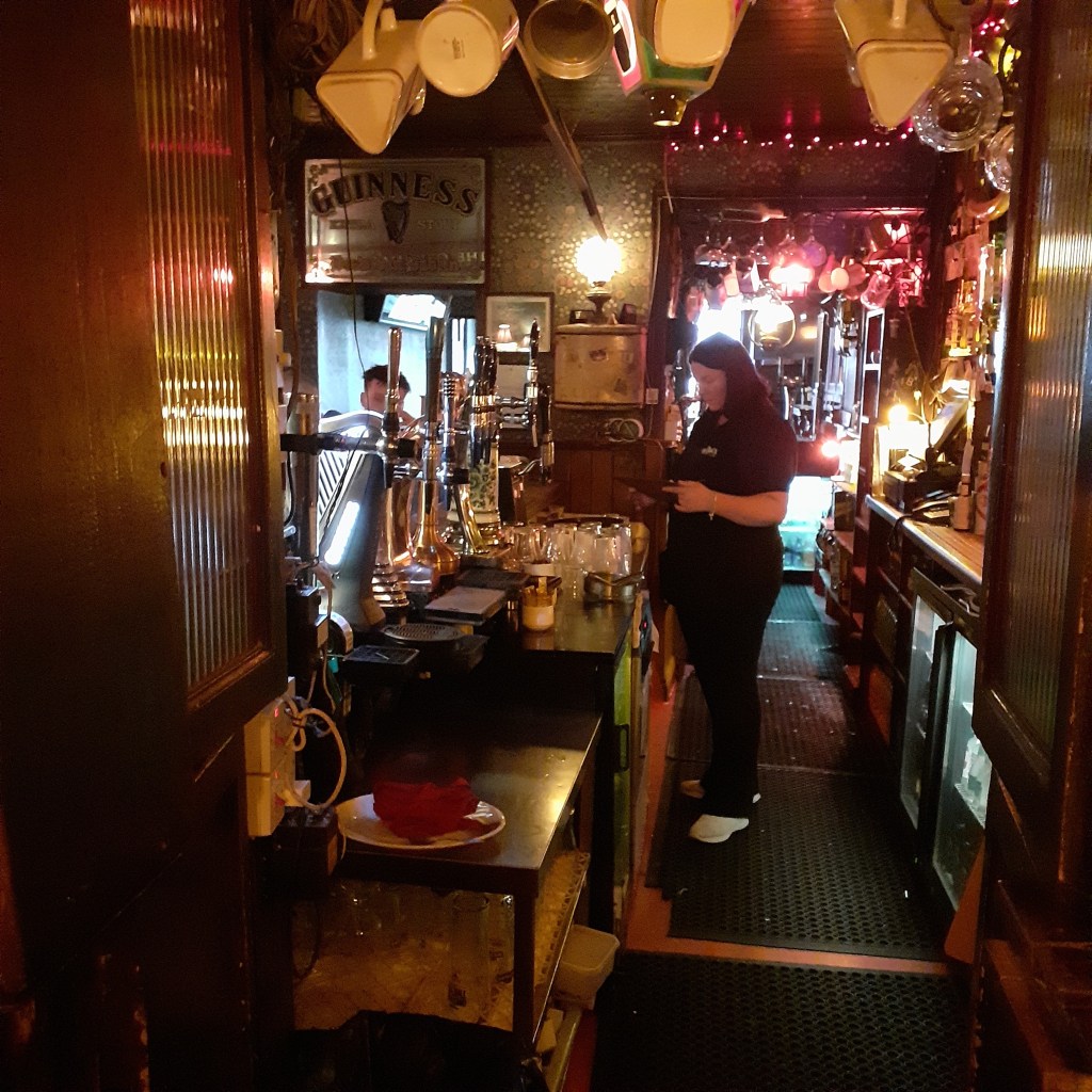 Katy Daly’s is situated across from the Castle entrance, on the Parade, an ancient historic street. A tavern in the old style, it’s ideal for a refreshing pint, or a meal, after the exertions of a castle visit. With sunshine spread over its front of house terrace, I had a pleasant time, accosted in the most friendly fashion by a couple of locals. Daly’s lays claim to being the oldest pub in Limerick. A pub, the Red Lion is recorded here in 1600, while the license can be traced back to the Halpin family in 1789. It takes its name from Prohibition era moonshiner, Katie Daly, born in California of Tipperary immigrants in 1872. Her father Bill was killed in a shootout with Wyatt Earp and his recipe for Poitin would endure thanks to his enterprising daughter. By the Prohibition Era, Katie operated out of Chicago were she fell foul of Al Capone, but escaped to the relative safety of San Francisco. However her enterprise came to the attention of the FBI and ended with her incarceration in Alcatraz, the island prison in the Bay. The only female prisoner there, she died before her fifteen year stretch was out.