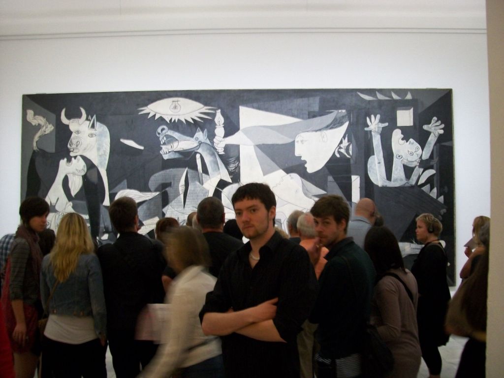 Pablo Ruiz Picasso was a radical innovator in the determinedly Avante Garde Fine Art of the twentieth century. As a young painter, his Blue Period and Rose period showed his realist skills, where colour and mood combine. He made a radical departure to develop the fragmented technique of cubism, with French painter Georges Braque and fellow Spaniard Juan Gris. Impossibly prolific, sometimes to the point of self caricature, true genius and the profound are evident in probably his best known work Guernica. This emerged from the the bombing of the Basque town by German and Italian airforce  during the Spanish Civil War. Picasso did not want the work shown in Spain during Franco’s dictatorship, and it was kept for over four decades at the MoMA in New York. A century after Picasso’s birth, Spain was restored to a democracy, and the painting returned, first to the Prado and since 1991 at the Reina Sofia, also in Madrid. Although first displayed behind bullet proof glass, it has since had no extra protection than any other painting. I took this photo of my son, Davin, in front of the unprotected painting in 2010.