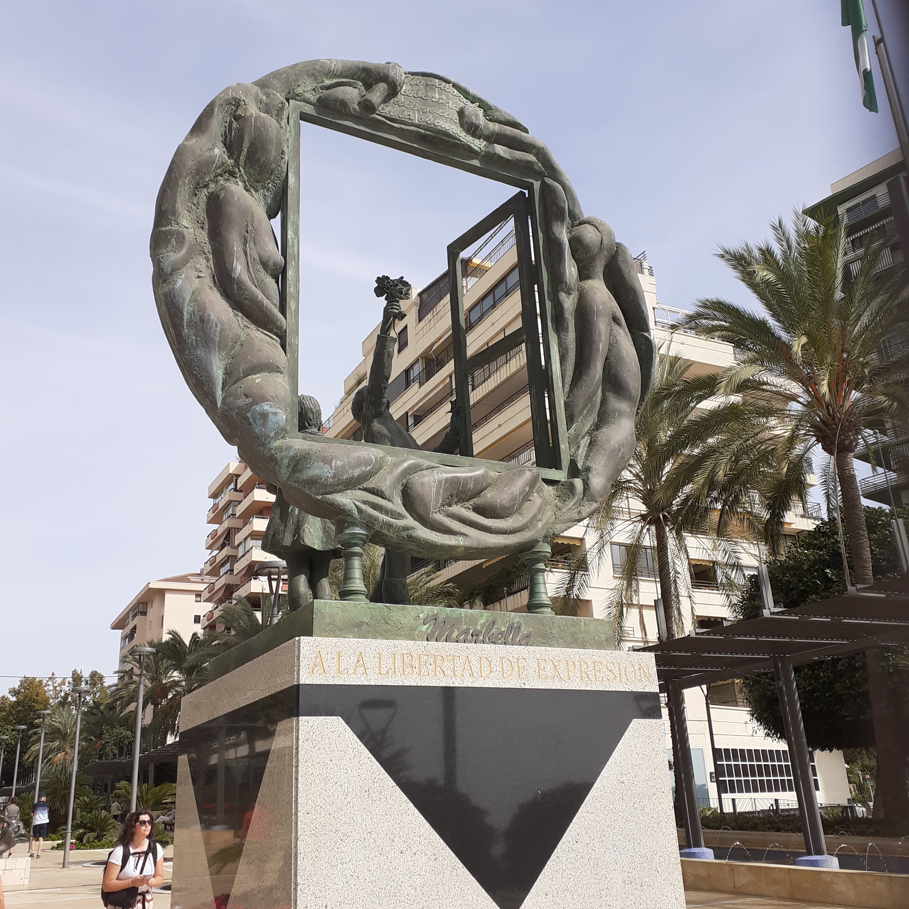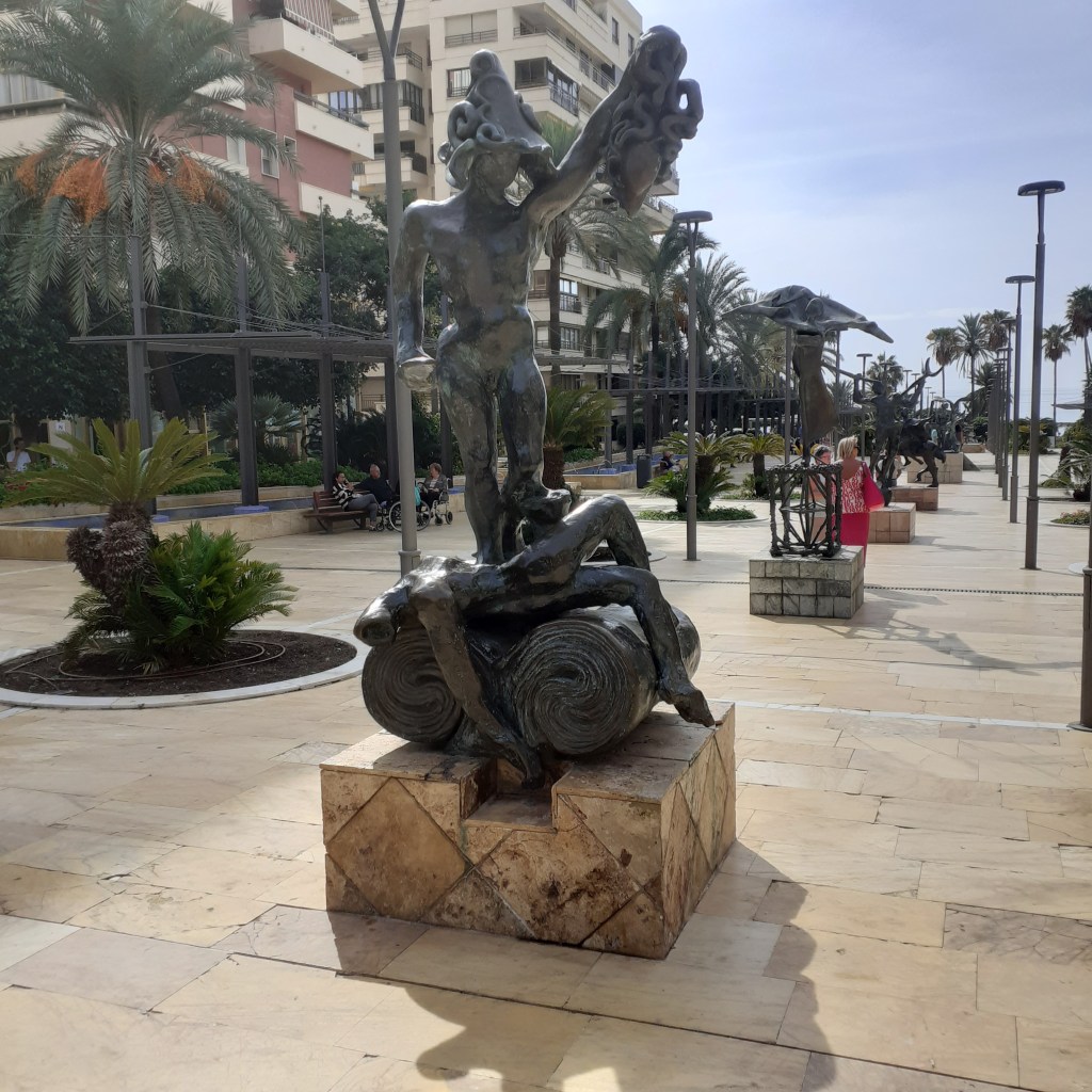 Beyond the park, The Avenida del Mar, as its name suggests, forms a wide esplanade sloping down to the seafront. It is lined with sculptures by Salvador Dali and others. Eduard Soriano is a notable other, his Monument to the Freedom of Expression overlooks the seafront promenade. This shows two figures at an open window surrounded by apt quotations, including the sculptor’s: Freedom does not die, it is born and sleeps daily.