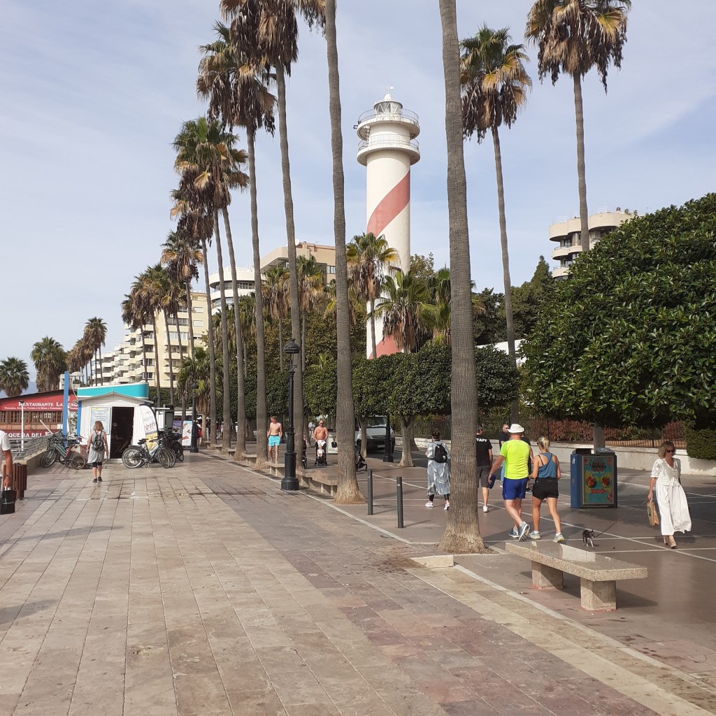 We walked to Marbella along the beach one morning. It’s about 6 miles from Elviria, and I was feeling the heat near the end. Still Spring, but climbing into the mid twenties by mid-day. Approaching the city outskirts there are a number of rugby pitches, and we are in the city proper when we reach Playa de Venus adjacent to the port. Puerto Deportiva with its modern green lighthouse lies beyond. On more sedentary days, there are regular busses along the coastal highway, the A7, for a more leisurely trip into town. It takes under half an hour.