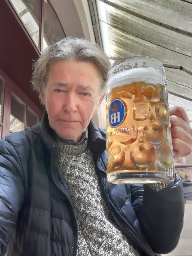 I find a bench in the courtyard beergarden which is quiet. I wrap my hand around a one litre stein, or masskrug. Steins were originally a stoneware mug, though now refer to the heavy glass with a handle synonymous with German beer drinking. There’s a technique to drinking such a volume for a lightweight like me. Slide your hand inside the handle and hold the glass body between palm and thumb. Lift and quaff. Repeat as necessary.