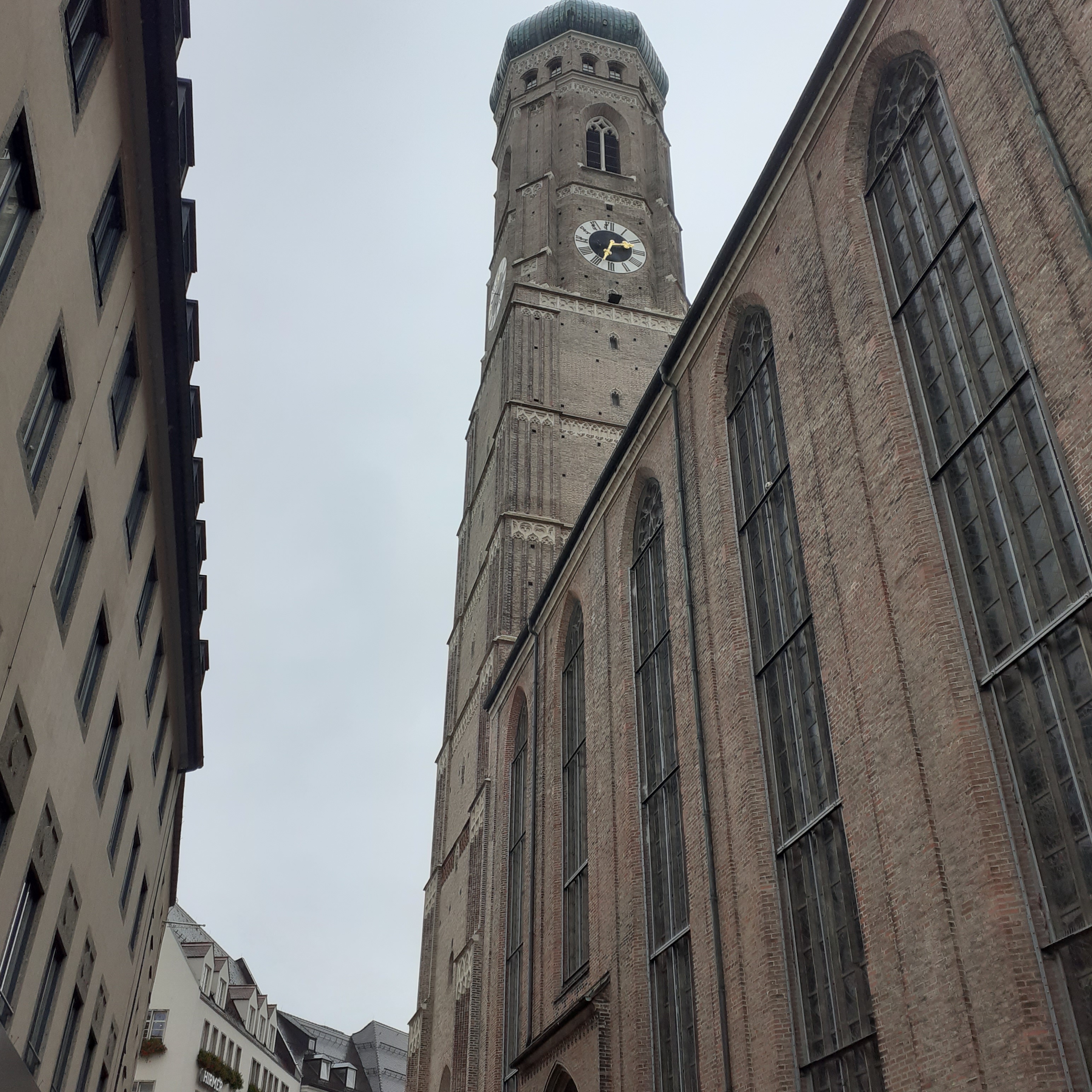 At last I align myself and walk back to the city centre. Marienplatz is that centre, a rectangular plaza dating back to 1158. It centres on the Marian Column, in honour of Our Lady, and erected in 1638 to commemorate the end of the Swedish occupation. The New Town Hall, a fabulous Neo-Gothic palace, forms the northern side of the plaza. Built in the mid nineteenth century and based on Brussels City Hall, it was extended in the early twentieth century with a soaring tower of 85 metres. The Old Town Hall marks the eastern end of Marienplatz, while to the west the towers of Fraunkirch loom. Frauenkirche, also dedicated to Our Lady, is the city cathedral. Its distinctive frontal round towers are the highest structures on the inner city skyline, almost a hundred metres tall and topped with onion domes. The church was built in the late fifteenth century, redbrick and sparse in style.
