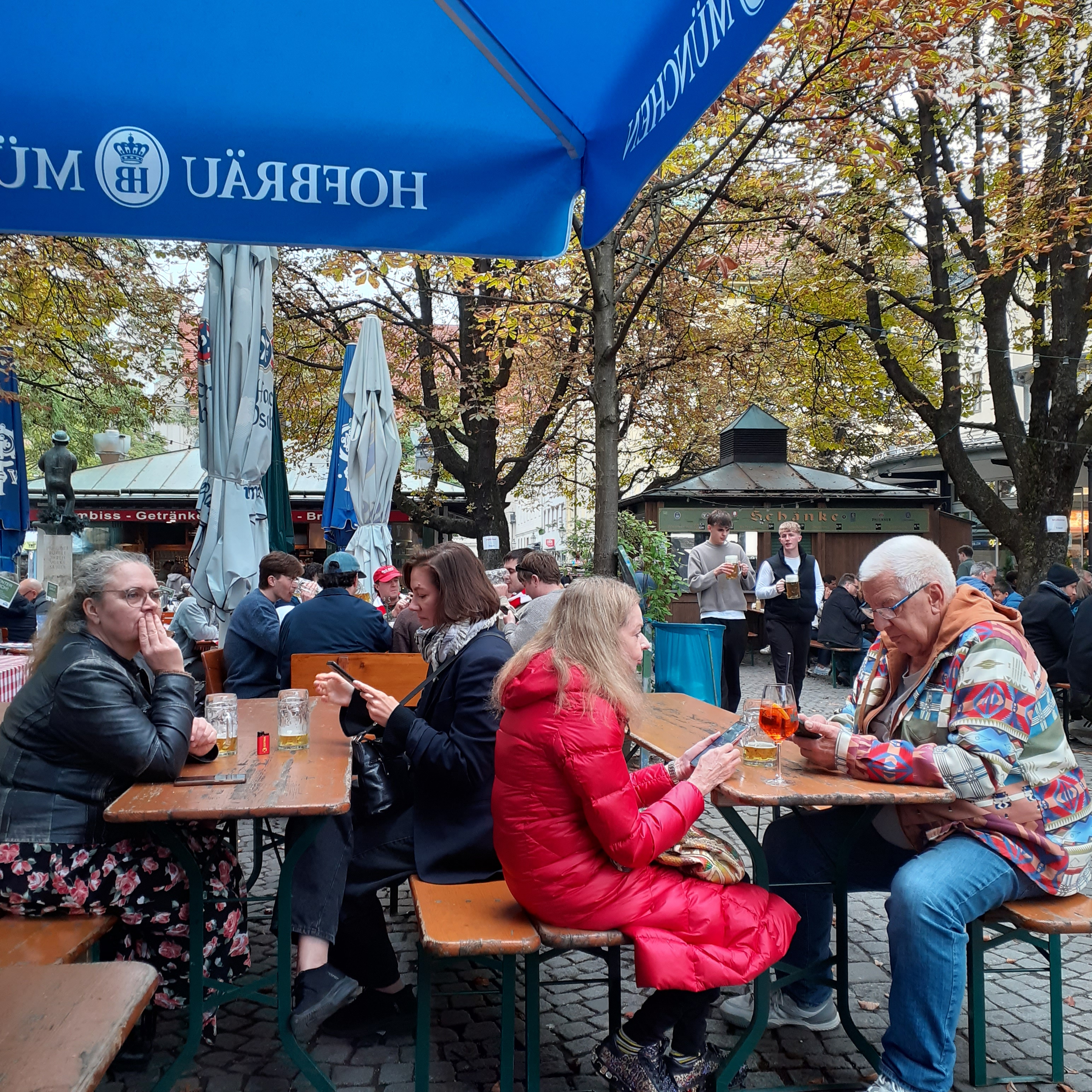 Platzl is a small pedestrian square lined with drinking and dining terraces. The Dubliner Irish Pub across the road provides a cozier port to put into. I can admire the Hofbrauhaus building from the outdoor terrace.