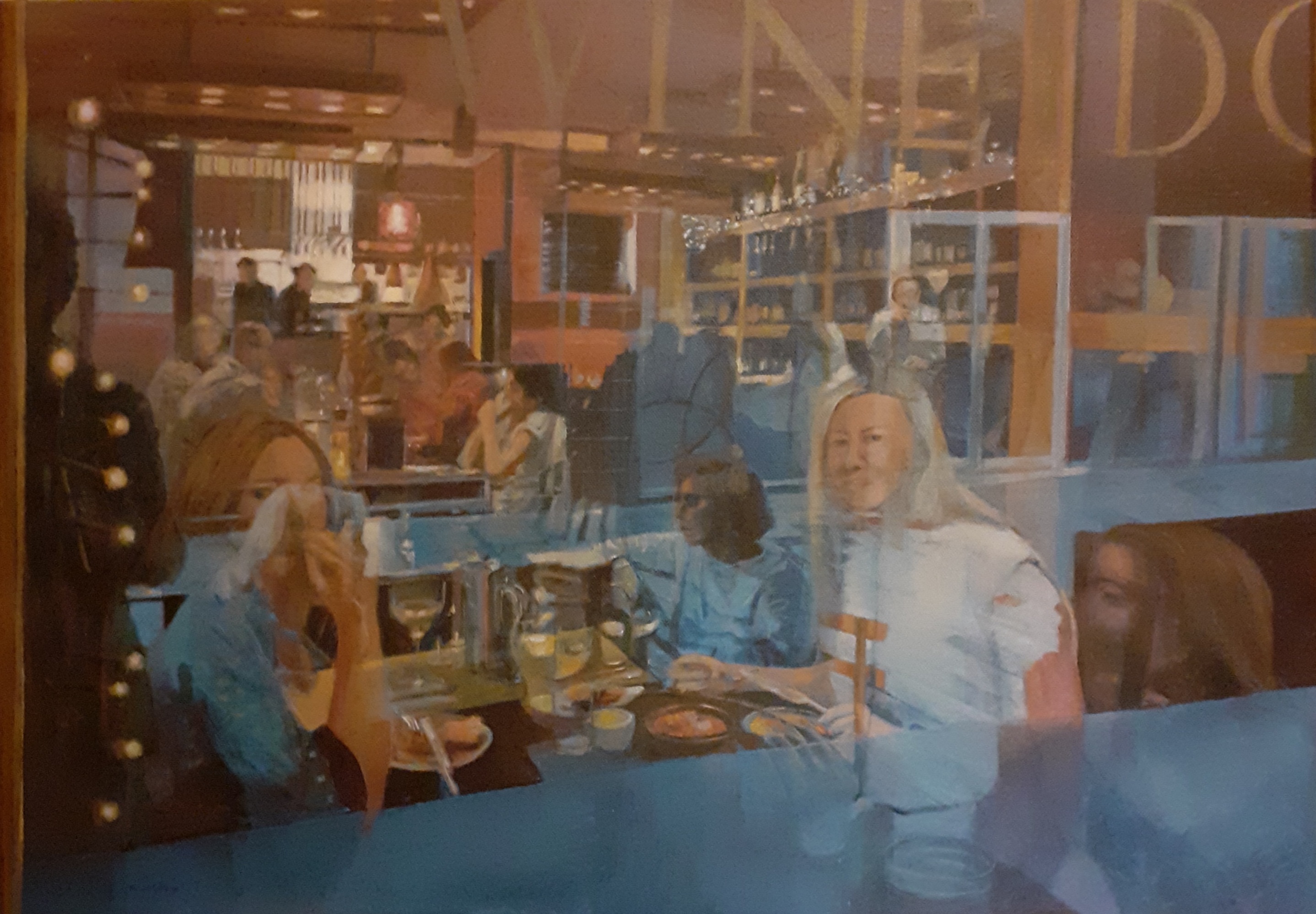 This painting is taken from our Isle of Man trip. The restaurant, Wine Down, is in Douglas. We sat on the front terrace. I took this shot looking into the crowded restaurant. The window catches interior and exterior, myself and M, and others, observing and being observed. It is a bit like a jigsaw puzzle of life. There are too many pieces and not enough time to fit them all together. And we only imagine the picture on the cover of the box to guide us.