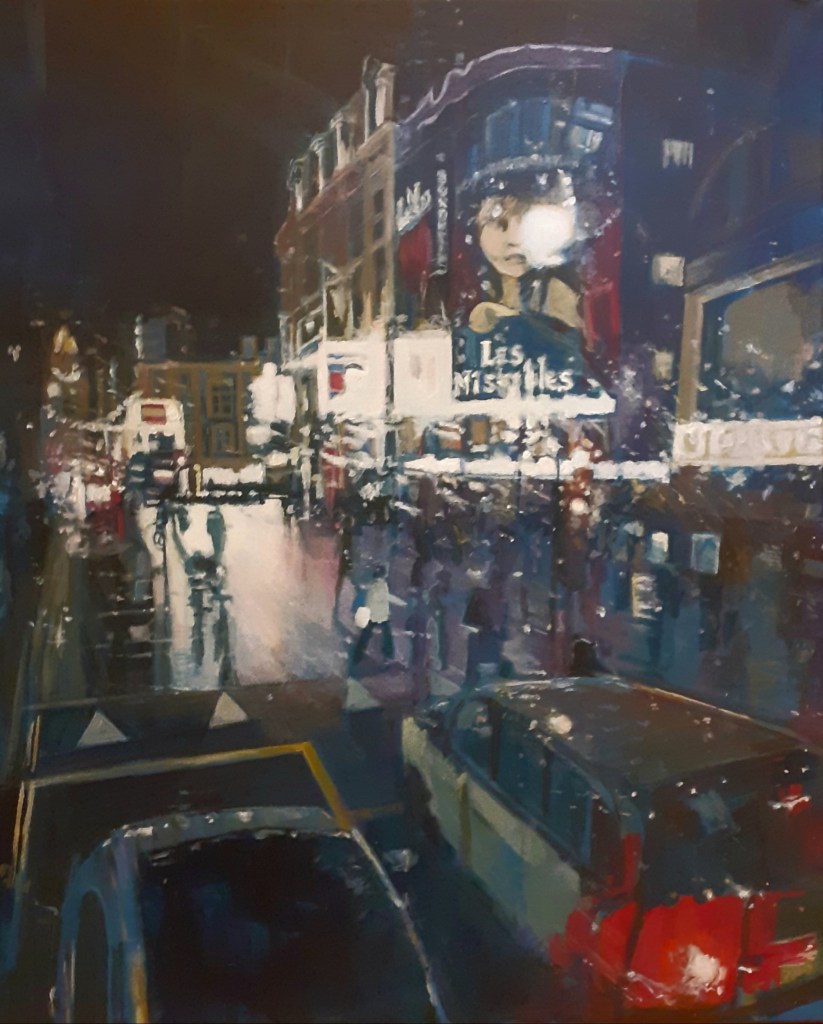 This painting is from my recent trip to London. We are on the front seat of the 14 bus heading down Shaftesbury Avenue. Soho is to our right and we are about to pass the Sondheim Theatre. Formerly the Queen’s Theatre, it was refurbished and renamed in 2019 and has hosted Les Miserables since 2004. London’s longest running musical has been playing since 1985. It is a sung through musical, without spoken text, conceived by Alain Boublil with music by Schonberg and is based on Victor Hugo’s novel.