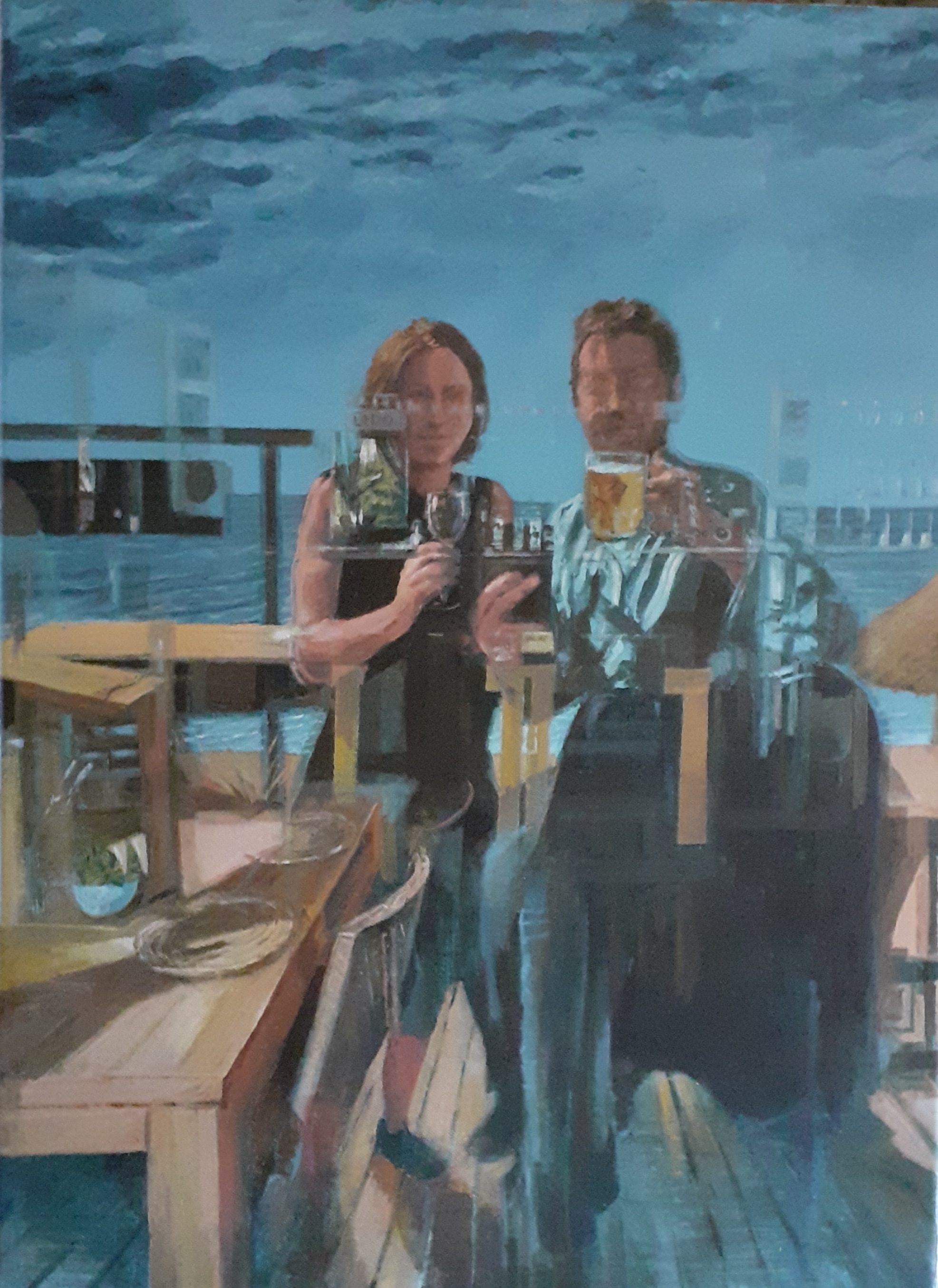 Painting this picture, I was struck by the shifting points of view within the tableau. We were photographing ourselves photographing ourselves. The observer, and author of the painting, is observed. It’s a self portrait, a still life and a landscape. The reflection itself is a double image due to the glazing. This gives a liveliness, a kind of shaky quality too. We are a blur against the immense physicality of the Med. There, but not there. A snapshot in time. Then gone.