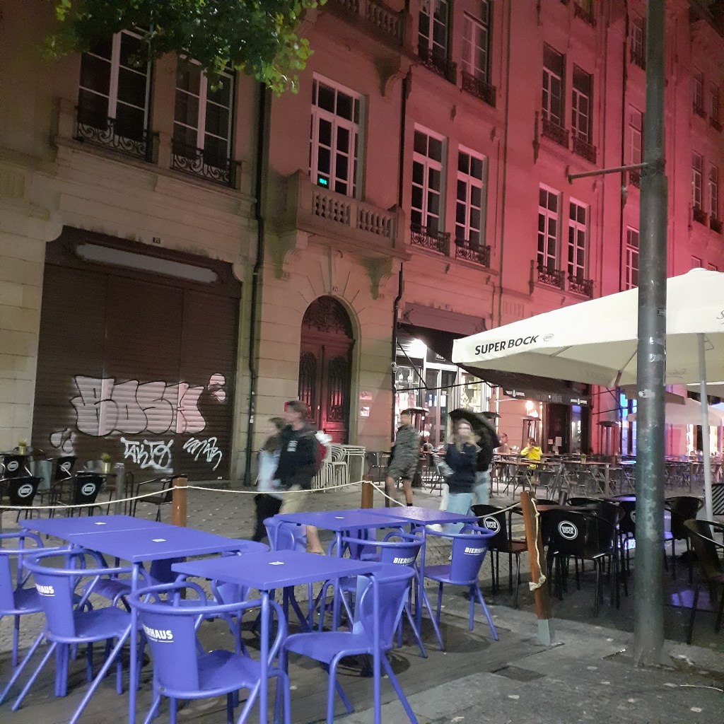 The city centre is, sadly, off limits, and I pick my way back uphill through the labyrinth of alleyways.Somewhere off Rua Almada I find a bar with blue tables, the perfect colour to enjoy the sinking light of evening. The bar is one where you order and carry, which is an improvement on the prevailing level of service. Outside it’s raining so I wait within while the sound system plays Iggy Pop lsinging the Passenger. Ignatius wrote this with Ricky Gardiner for his second solo album Lust for Life in 1977. David Bowie is on piano and backing vocals.