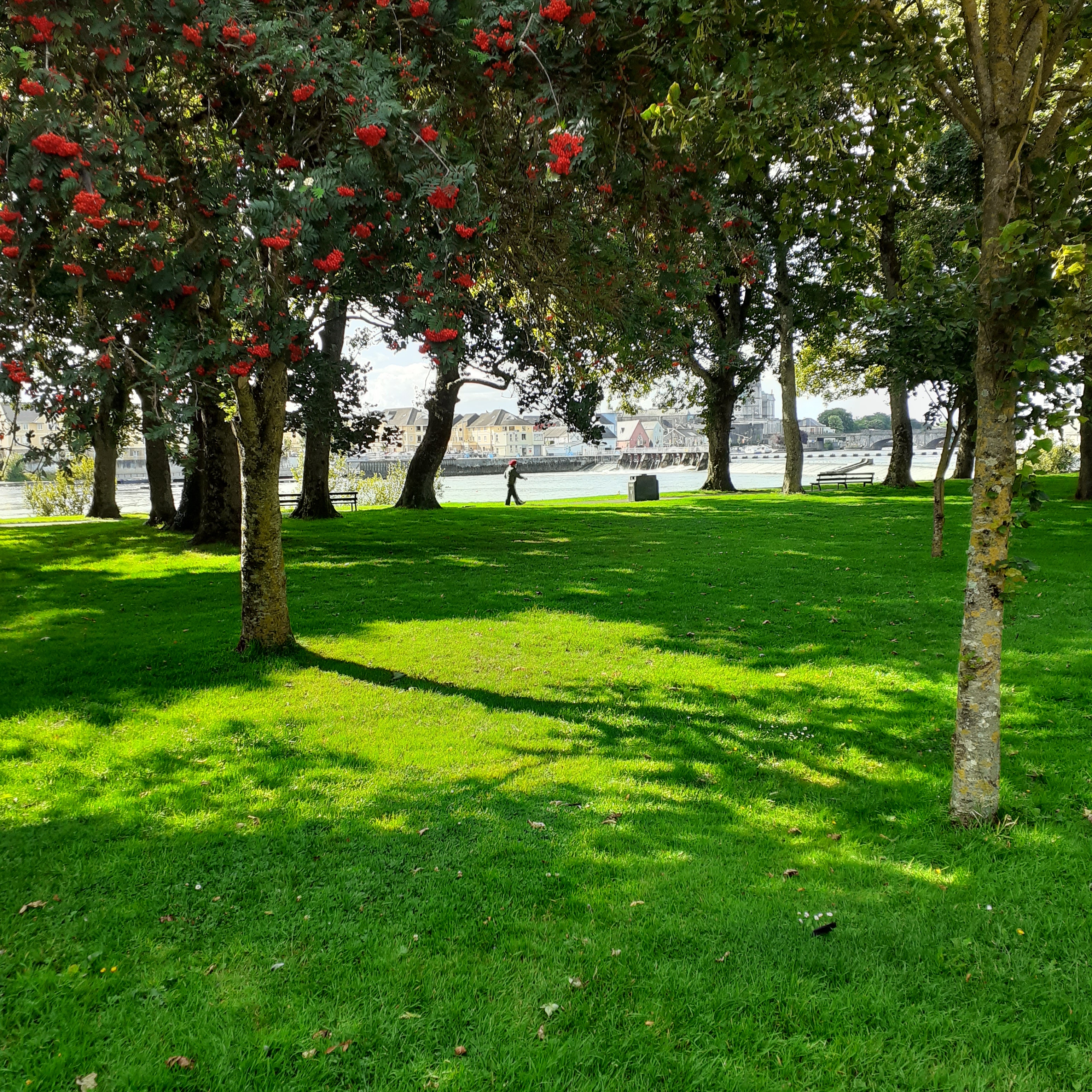 Returning to the East bank, the town’s gearing up for evening rush hour, comparatively speaking. We make our way out to the Golden Island Shopping Centre which opened in 1997. Nearby, Burgess Park beckons with woodland, walking trails, a playground and memorial garden. Sloping down to the Shannon, it is the ideal urban oasis. Sitting there in the early evening sunshine as people promenaded and relaxed, I was put in mind of Seurat’s great painting the Isle de la Grande Jatte. It just shows, that through the ages and across longitudes, people maintain a continuity, enjoying the pleasure of harmony amongst trees and flowing rivers, in the company of themselves or others.