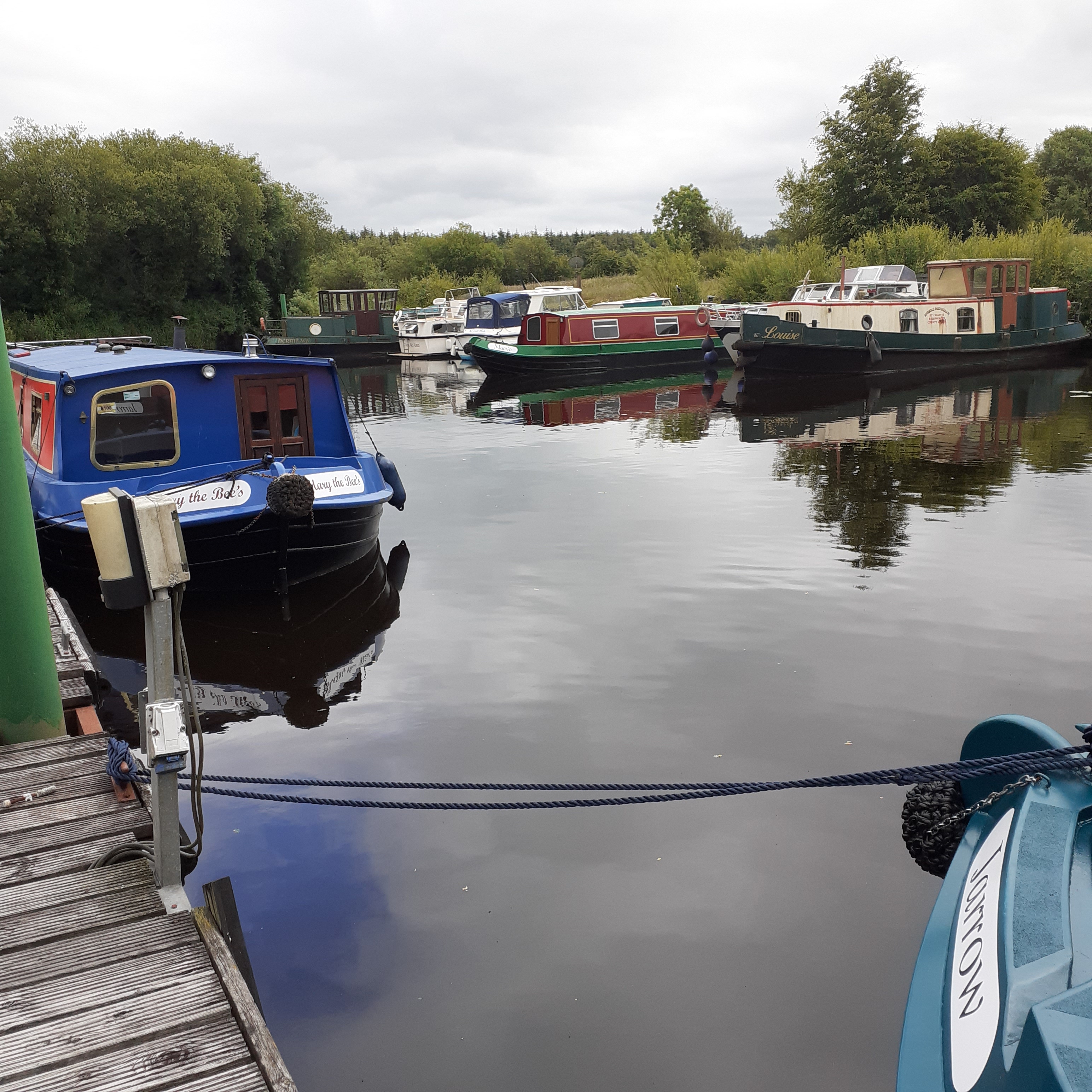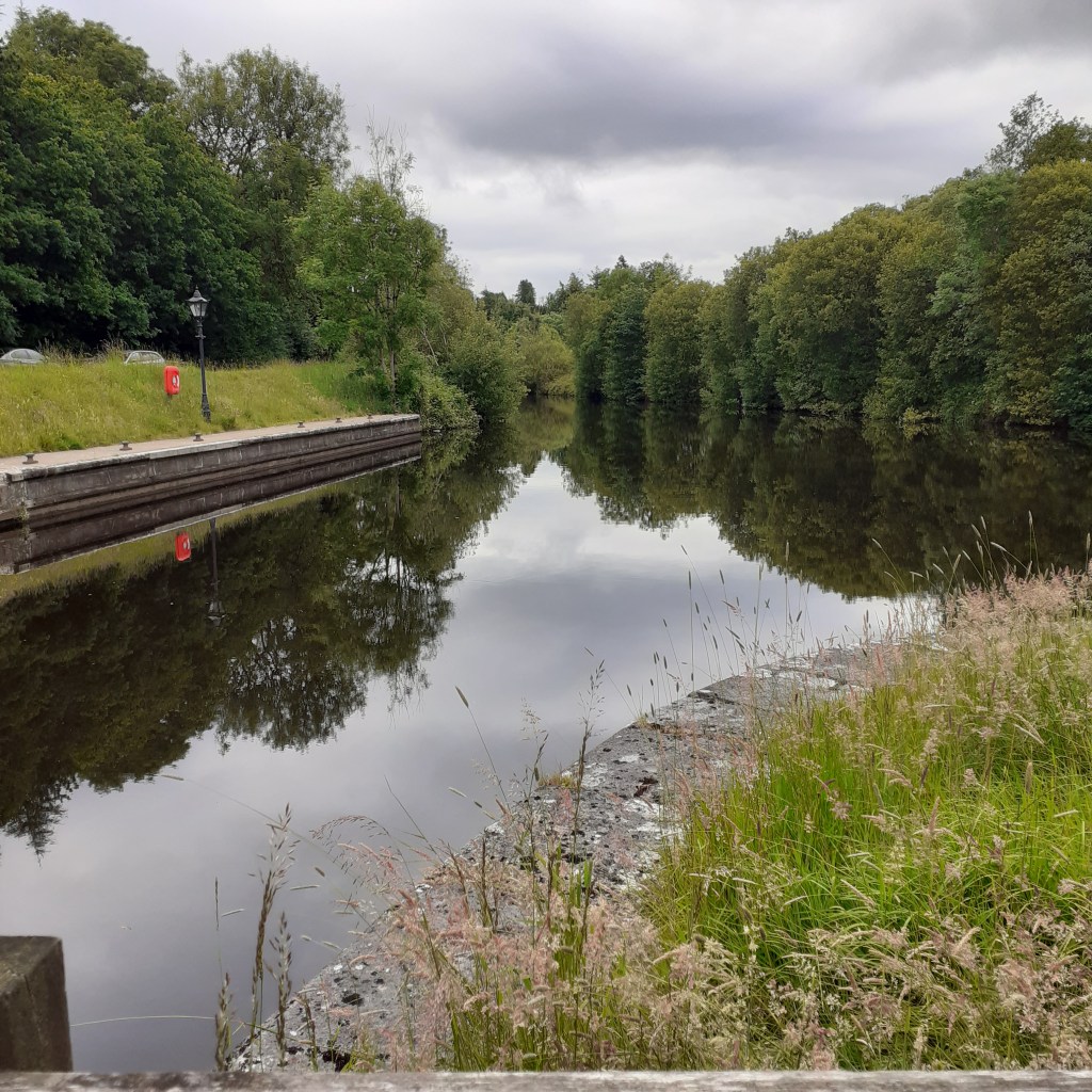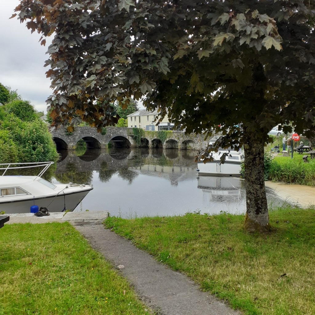 A main attraction for us was the Ballinamore Walkway and Cycling trail, a four and a half kilometre walk to the town, taking about an hour. It’s mostly flat, being along a canal, and is an extremely pleasant route through woodland and farm. Near Ballinamore there’s a weir and lock with an attractive expanse of placid water in the shade of the trees. We come into the town through a small parkland circling the mooring spot for river craft, framed by its multi-arched stone bridge and quayside.