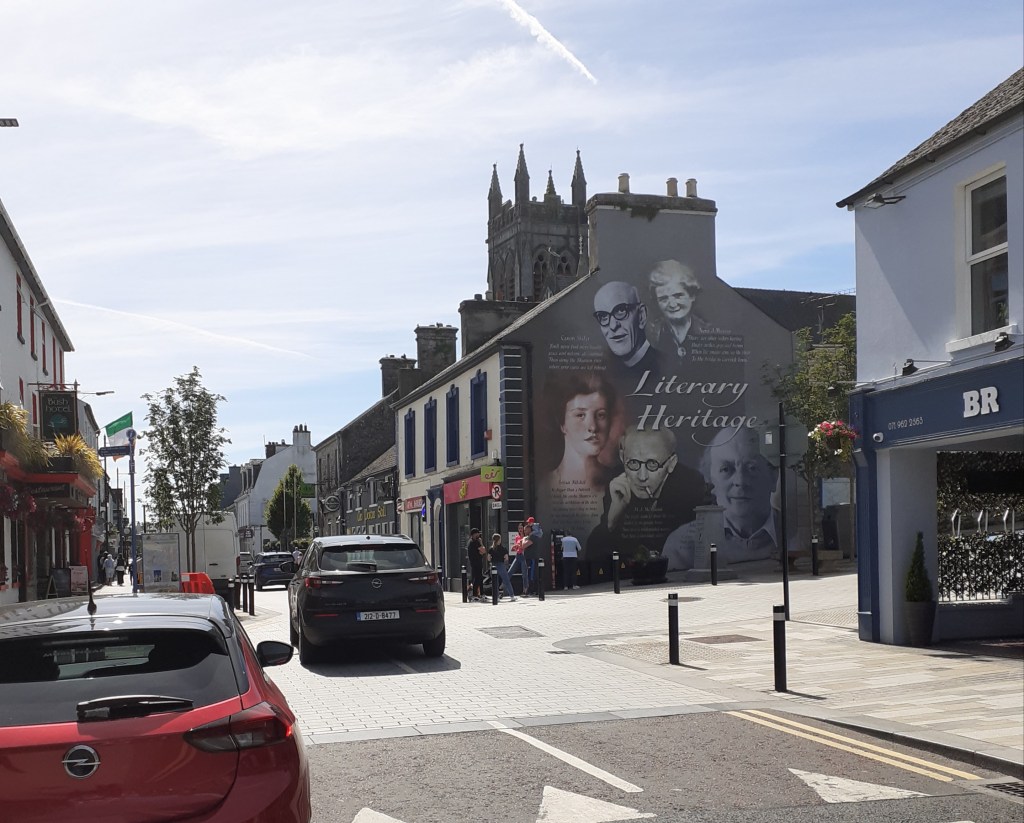 We pass through Carrick on Shannon on our drive home. Carrick is Leitrim’s county town, with a population of 4,700 people. It is one of the fastest growing towns in the country, developng a thriving tourist industry based on the amenity of the River Shannon. There is a palpable buzz about the town during the summer. We stop for a coffee at a colourful pavement cafe, VDA. Down the street we notice a fine gable end mural of the county’s literary heritage. Painted by artist Nik Purdy in 2020 it includes such writers as Susan Mitchel, Canon Slator, Nora Murray, M.J.McManus and, of course, John McGahern.