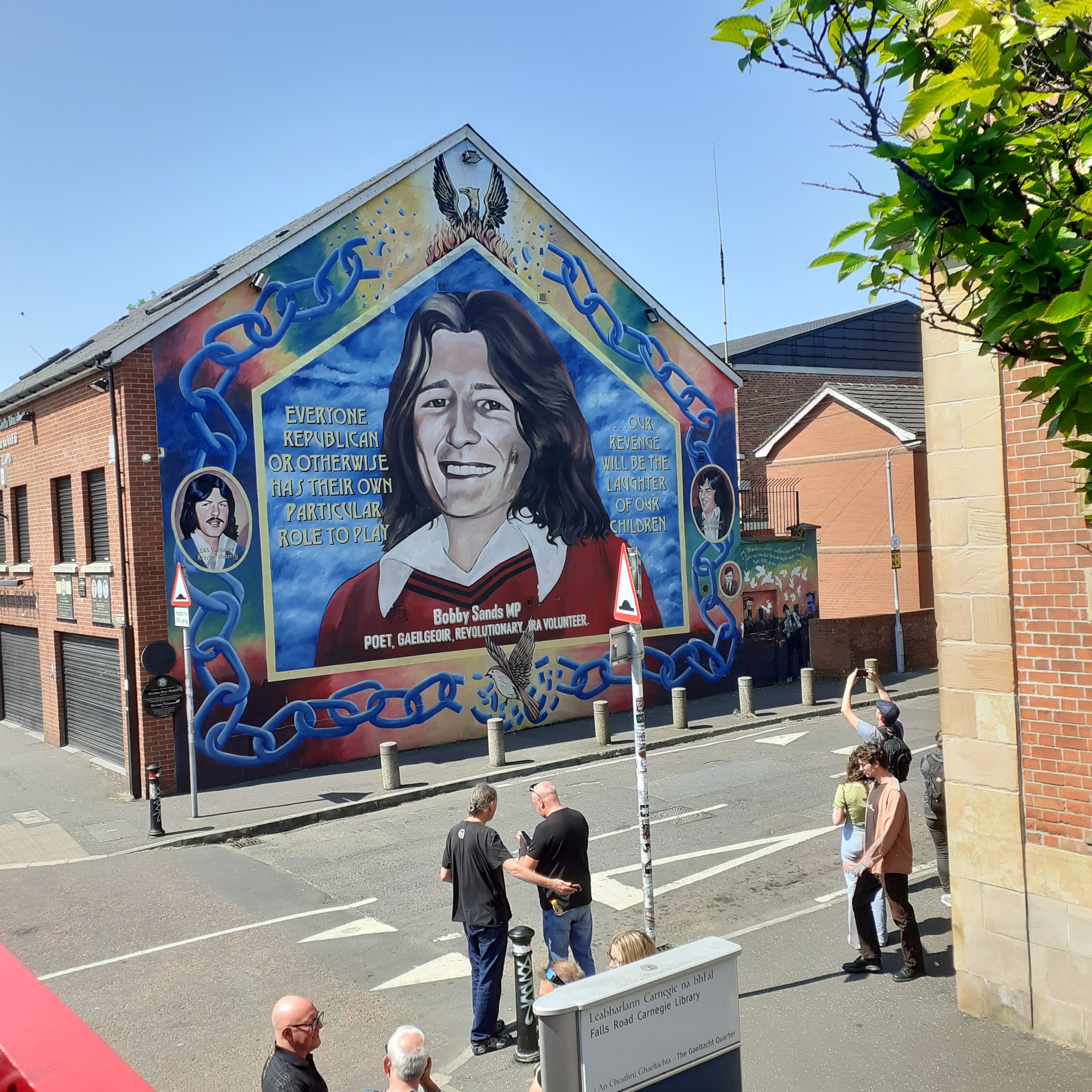 The tour heads west towards the Falls Road, a two mile long thoroughfare heading from the city centre to Andersonstown. The area is home to the Catholic community of West Belfast. We stop at the Bobby Sands mural, one of the most famous of Belfast’s many political murals. It dates from 1998, around the corner of the Falls at Sevastapol Street, on the gable end of the Sinn Fein hq. Sands was sentenced to fourteen years in the H-Block at Long Kesh for possession of a firearm in 1981. He went on hunger strike to campaign for political prisoner status and was elected MP for Fermanagh South Tyrone. After sixty six days he died at the age of twenty seven, in May. A further nine men died before the hunger strike was called off in October.