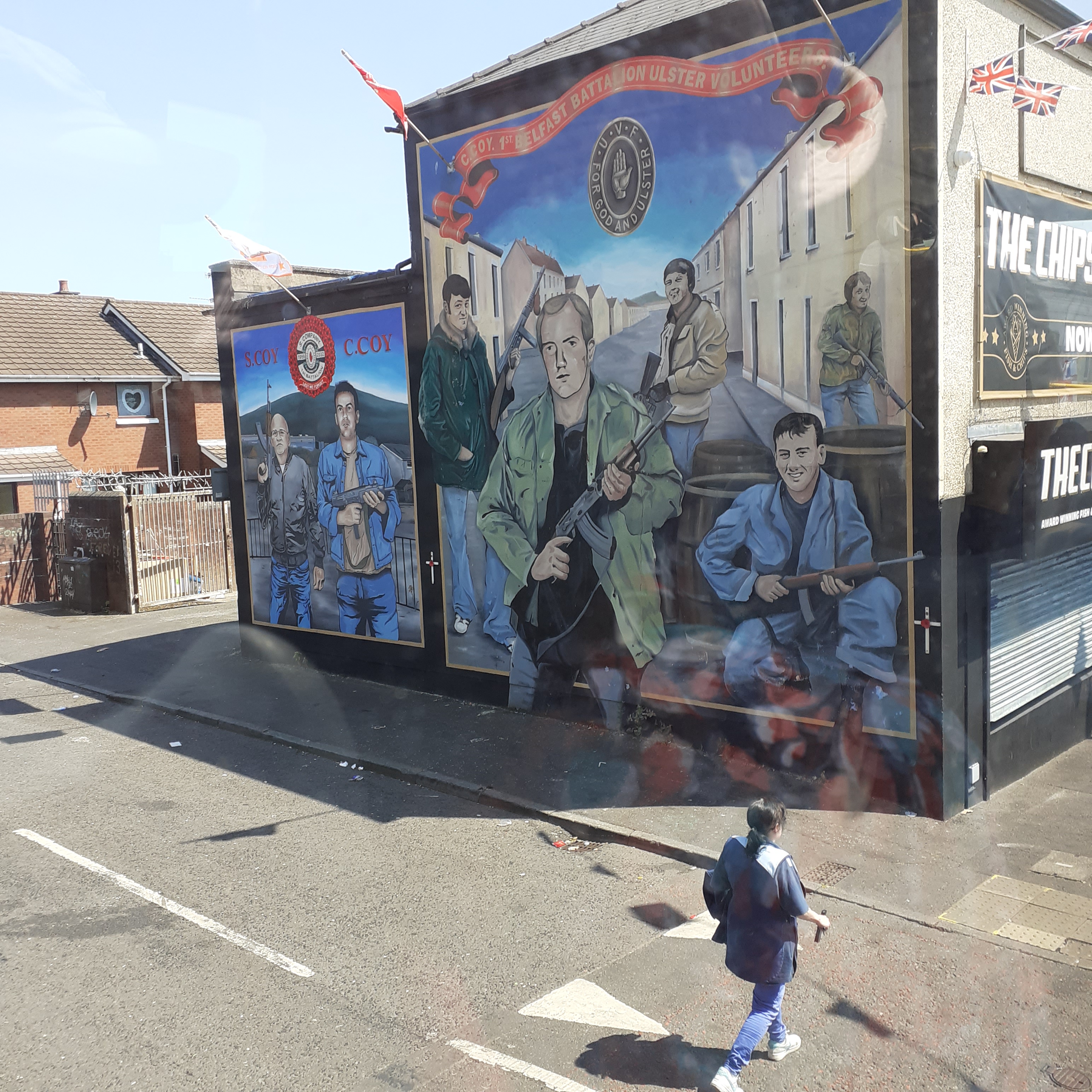 Through a double gate, we leave the Falls and enter the Shankill area, a Loyalist enclave. Murals now switch to assertions of Britishness with the Union Jack and King Billy (William of Orange) signifying that you’ve crossed the divide. That divide is demarcated by the Peace Wall on Cupar Way. This was erected by the British Army in 1969 to prevent inter community strife between Nationalists and Loyalists.