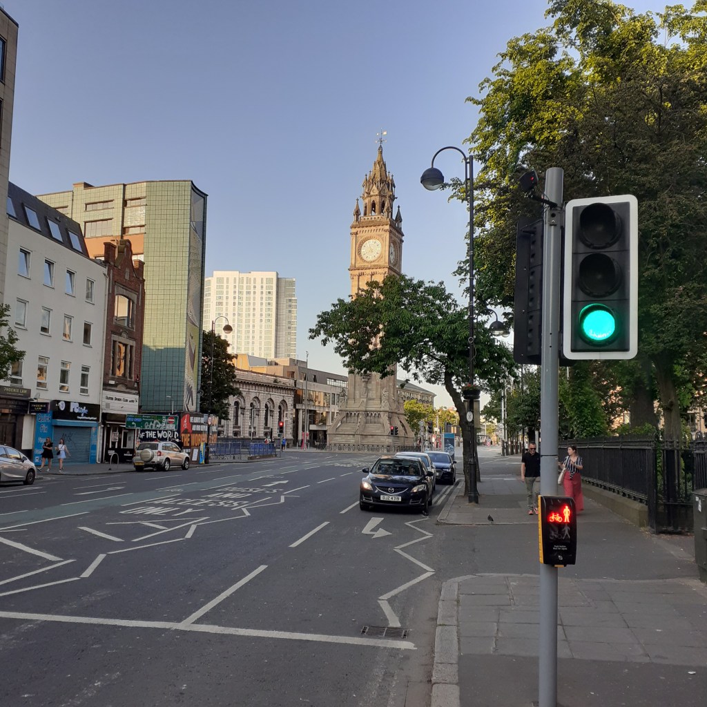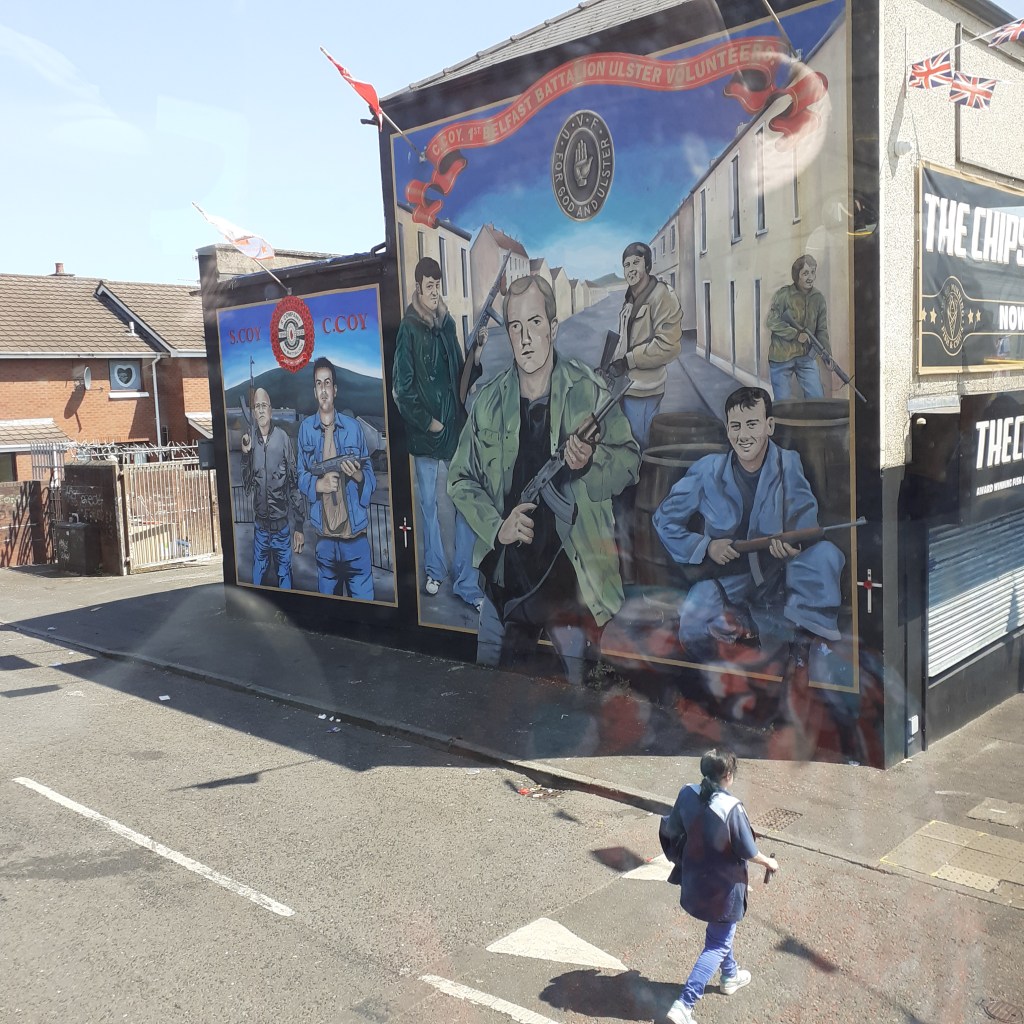 Further down the Falls we glimpse Divis Tower, a twenty storey residential block from the sixties. Standing 200 foot tall it was a significant landmark of the Troubles. The British army occupied the top two floors as an observation post, though they could only access it by helicopter. Residents moved back in fifteen years ago.