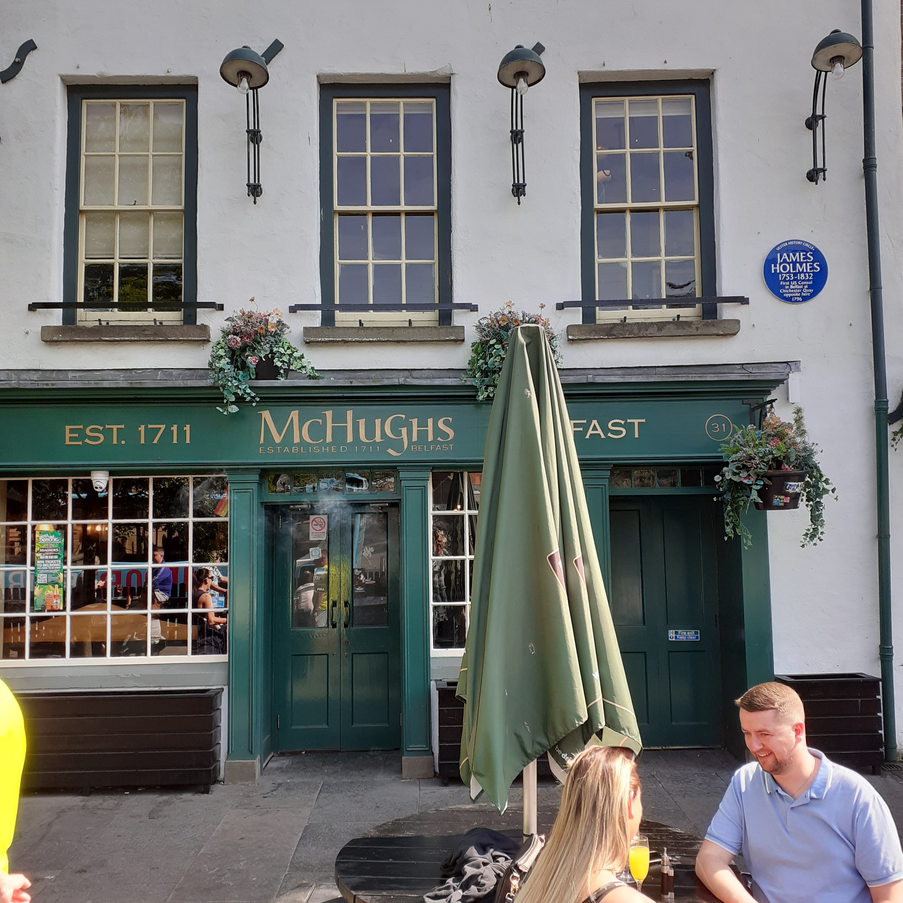 Our last night on the town brings us to Bittles Bar. Occupying a flatiron wedge at the junction of Victoria Street and Church Lane, it dates from 1868, when it was known as the Shakespeare. The literary theme continues inside the small triangular bar. A great selection of paintings are crammed into every available space with group portraits of Irish literary and sporting heroes enjoying a few pints. There’s a large canvas of Yeats, Behan, Beckett, Wilde and Joyce, while peace era iconography brings together erstwhile combatants of the Troubles, Adams and Paisley sharing a joke. The pub’s most popular poet seems to be Padraic Fiacc who gazes down, not quite benignly, at the bar. A spiky quote: Screeching gulls in a smoky bacon sky, hints at a spiky character. Christened Patrick O’Connor, he was born in Belfast, the son of a barman. His family lived in the Markets area nearby, having been burned out of their home in Lisburn. They moved to New York and Padraic grew up in the notorious Hell’s Kitchen area. A case of out of the frying pan and into the fire. He connected with his Belfast roots in the forties and returned to live here in 1956. A member of Aosdana, he died only recently, in 2019 at the grand age of 95.