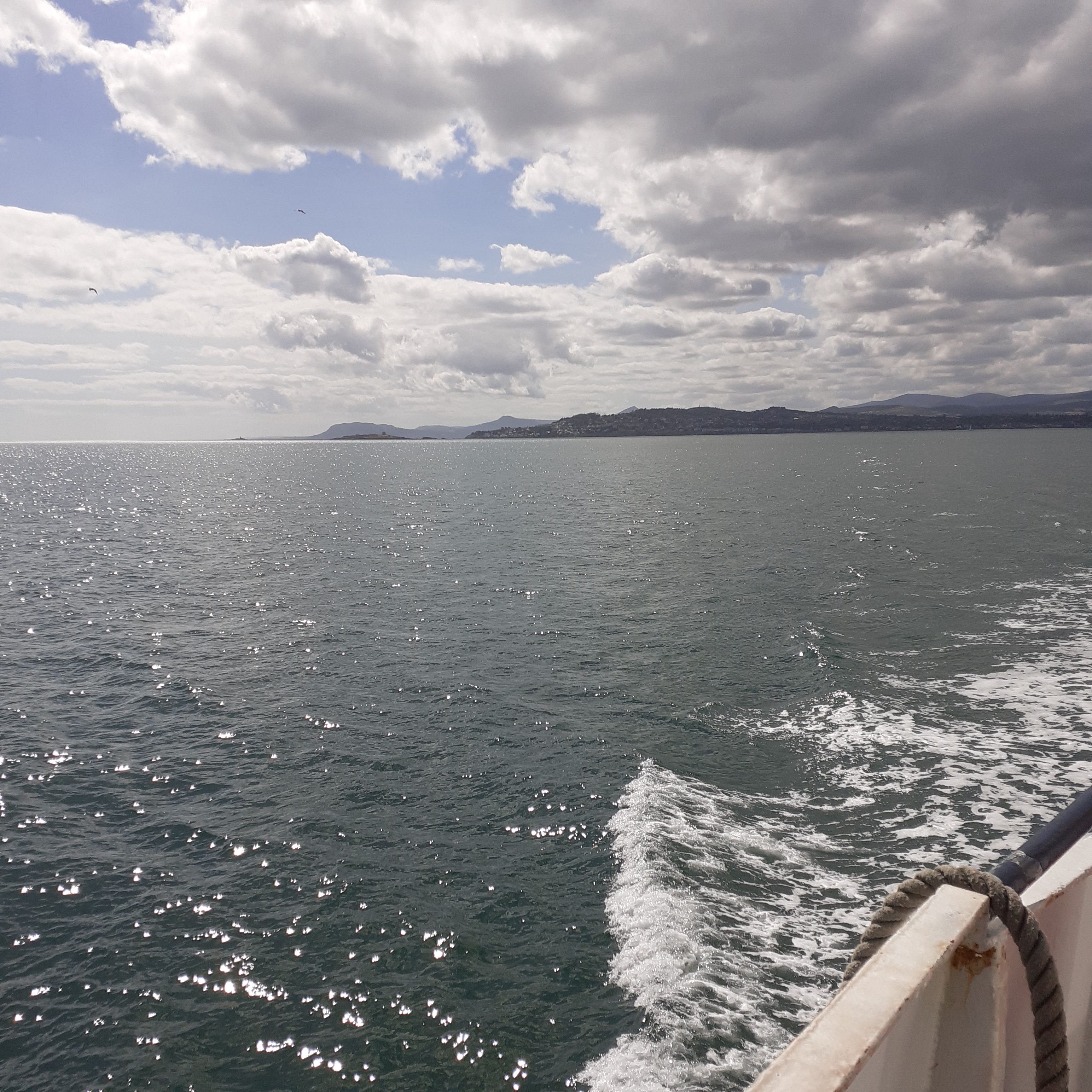 About seven miles out to sea is the distinctive Kish Lighthouse, a concrete tower with a helicopeter landing pad on top. It is sunk into the Kish Bank, a sand bank long a notorious trap for shipping. It was signalled by a lightship from 1811 to 1965 when the modern lighthouse was installed. We’re lost for a moment in the unique embrace of Dublin Bay. Bray Head, the Sugarloaf Mountians, and Dublin Range form the backdrop to Dublin’s Southside. North of the city we look into the mouth of the low lying central Plain, only Howth Head to the north as an outstanding feature. A fuller profile of the east coast waxes into view. There’s the beginnings of that lonely feeling of setting sail from Ireland, while simultaneously, the consolation of the embrace awaiting the wanderer’s return.