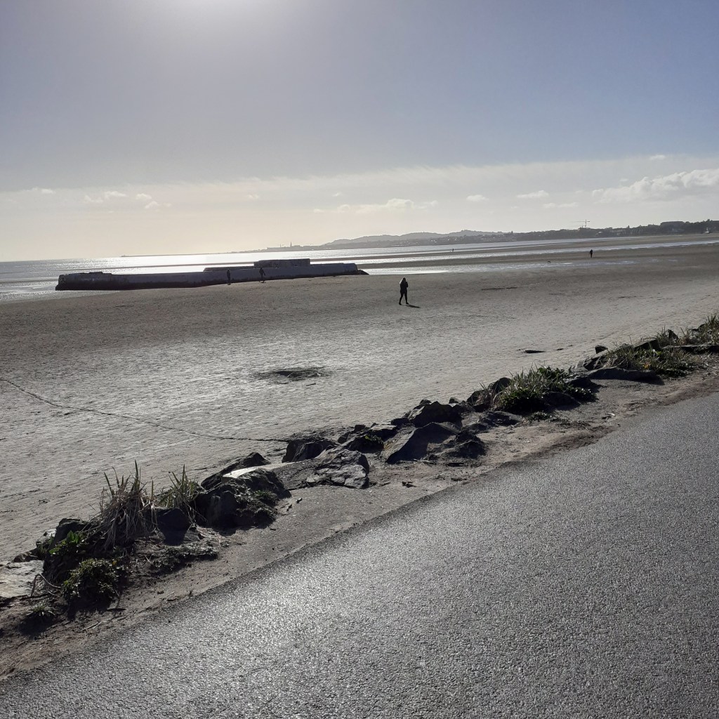 Within all this nothingness there’s the odd intrusion of a low, stone structure. These are the ruins of Sandymount Baths. They were built in 1883 by the Merrion Promenade Pier and Baths Company. The baths measured forty metres square with segregated bathing for men and women. Stretching out from the shoreline was a 75 metre lattice work pier with wooden decking. There was a bandstand half way along with Summer concerts twice a week. The adjoining Strand Road promenade was lined with kiosks selling, amongst other things, cockles and mussels alive alive oh! The good times of the Belle Epoque were not to last, and the pier fell into disrepair and was demolished in 1920.