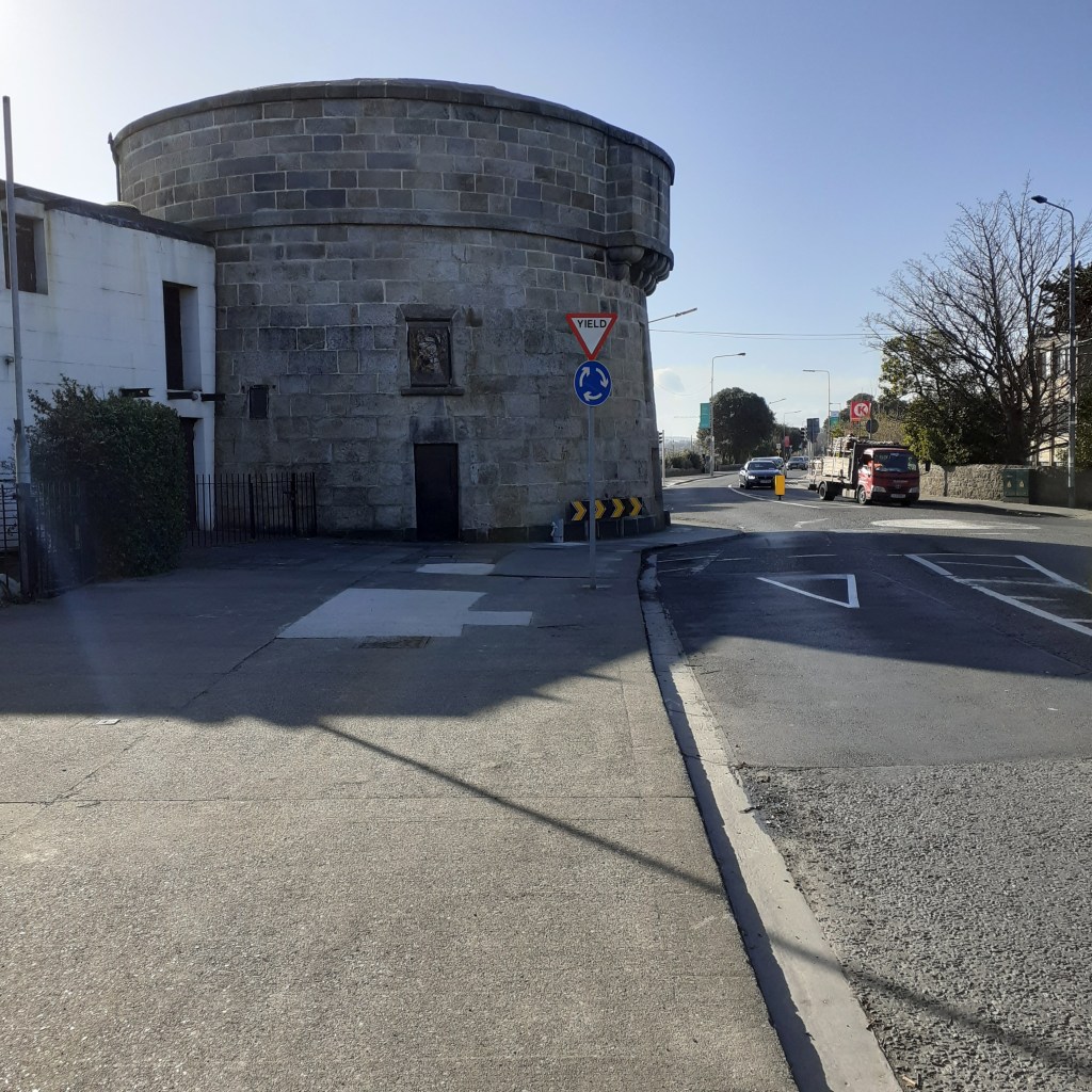 About midway along the Promenade, there’s a Martello Tower. A string of twenty eight of these towers were built along the Dublin coastline from Balbriggan to Bray beach during the Napoleonic Wars. This one was built in 1804. A century later it became, for a while, office of the Dublin United Tramways Company. There’s a disused modern building attached, once functioning as tearooms and a restaurant. The tower itself forms a chicane where it butts onto the main road.