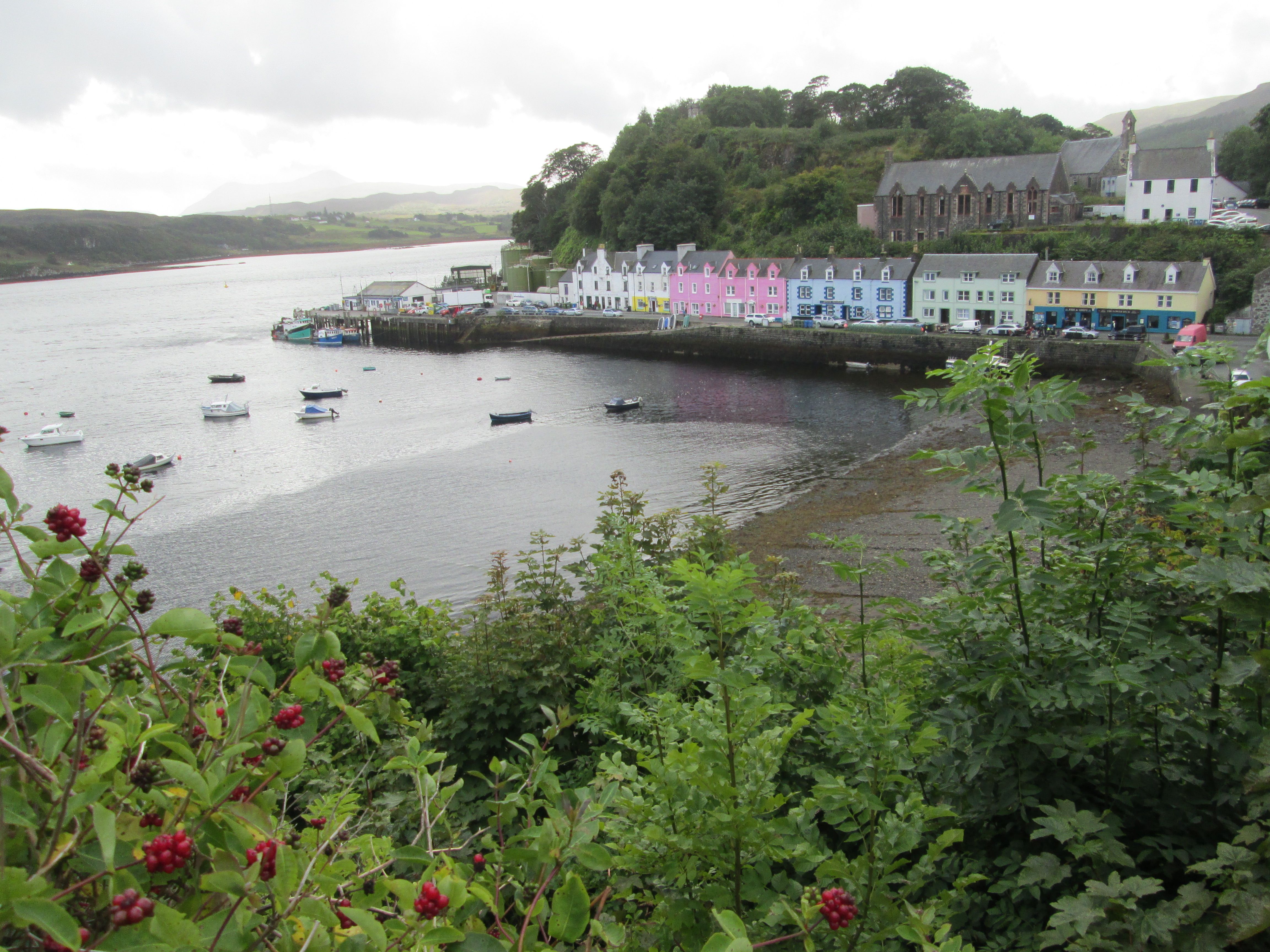 Portree is pleasant to potter around. Coming in from the empty hinterland, there’s plenty of life and commerce. The high town has a square and a couple of lively streets. There is, inevitably, a Bank Street. Plenty of shops, too, and a few decent pubs. There’s a drop down to a colourful dockside. The town curves around the bay, the housing arrayed attractively in terraces above. I’d reckon this is a good haven for sketching, although we don’t have time to indulge.