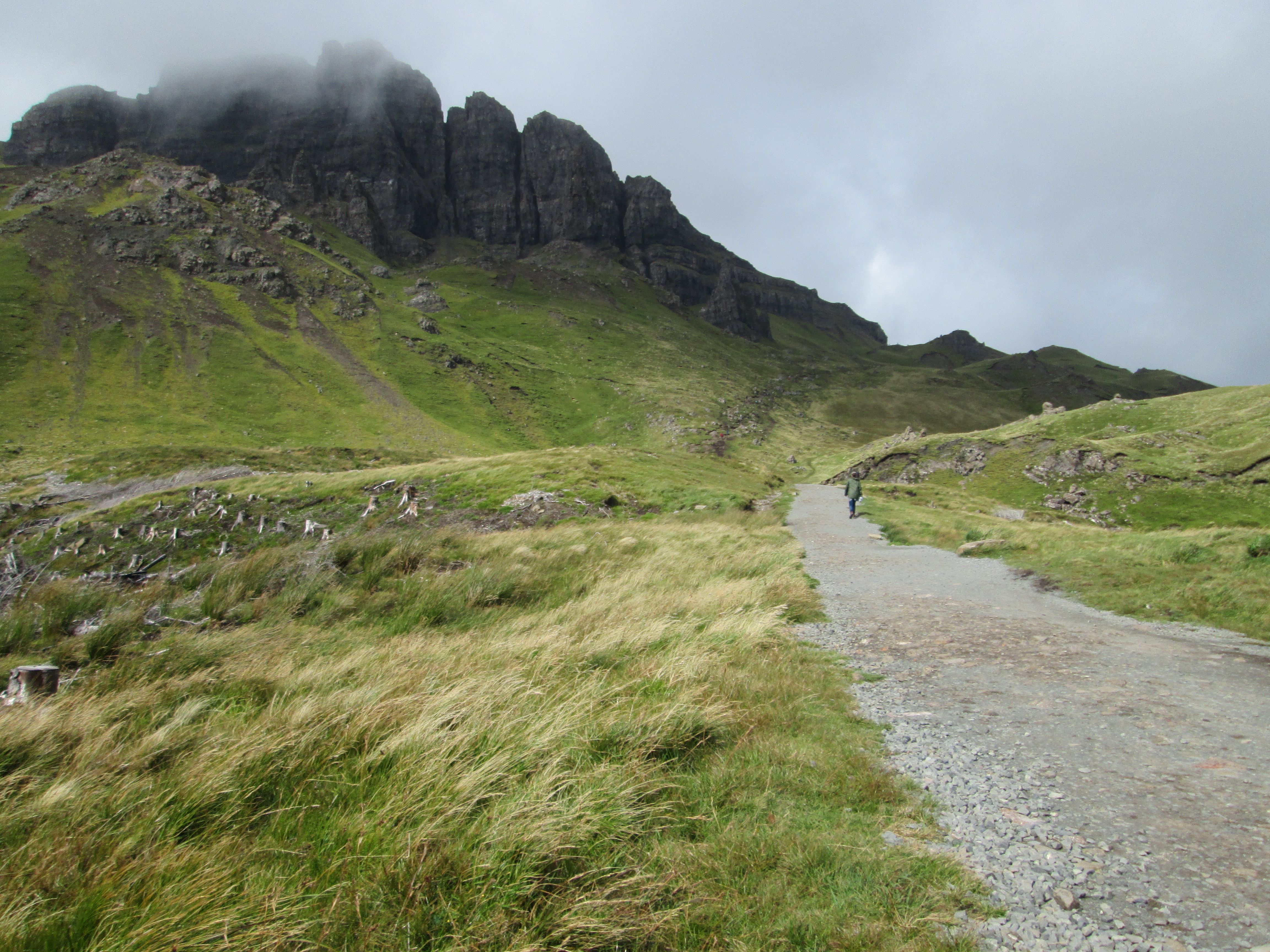 We head up the coast to the Old Man of Storr. This is a startling formation, not unlike a raised and weathered Giant’s Causeway. The geological formation is similar, being made of basalt, resulting from the rapid cooling of ancient submarine lava. There’s a well worn path snaking upwards. The destination is a bit further than we’d bargained so thirty minutes in we get to a good vantage point about halfway up and enjoy the view. Much debate on the exact configuration of the Old Man himself, but while we differ on details, I figure it’s pretty convincing.